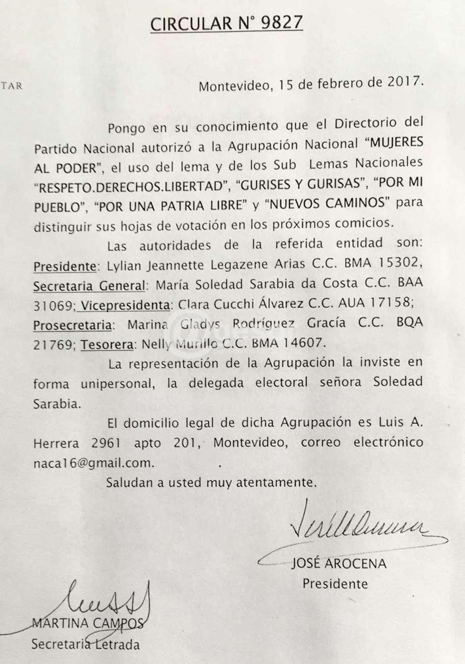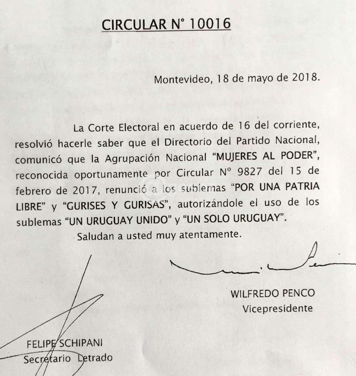 El texto de la circular expresa: "La Corte Electoral en acuerdo del 16 del corriente resolvió hacerle saber que el Directorio del Partido Nacional, comunicó que la Agrupación Nacional "Mujeres al Poder", reconocida oportunamente por Circular N° 9827 del 15 de febrero de 2017 renunció a los sublemas "Por una Patria Libre" y "Gurises y Gurisas", autorizándole el uso de los sublemas "Un Uruguay Unido" y "Un Solo Uruguay".