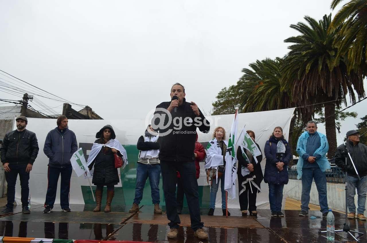 Funcionarios de Salud Pública de varios puntos del país llegaron a Mercedes para participar de la movilización convocada por la Federación de Salud Pública. Como estaba previsto se congregaron en Plaza Independencia para marchar hasta el Hospital Mercedes “Zoilo A. Chellle” donde realizaron u n acto, bajo la lluvia que a esa hora caía con fuerza en Mercedes.