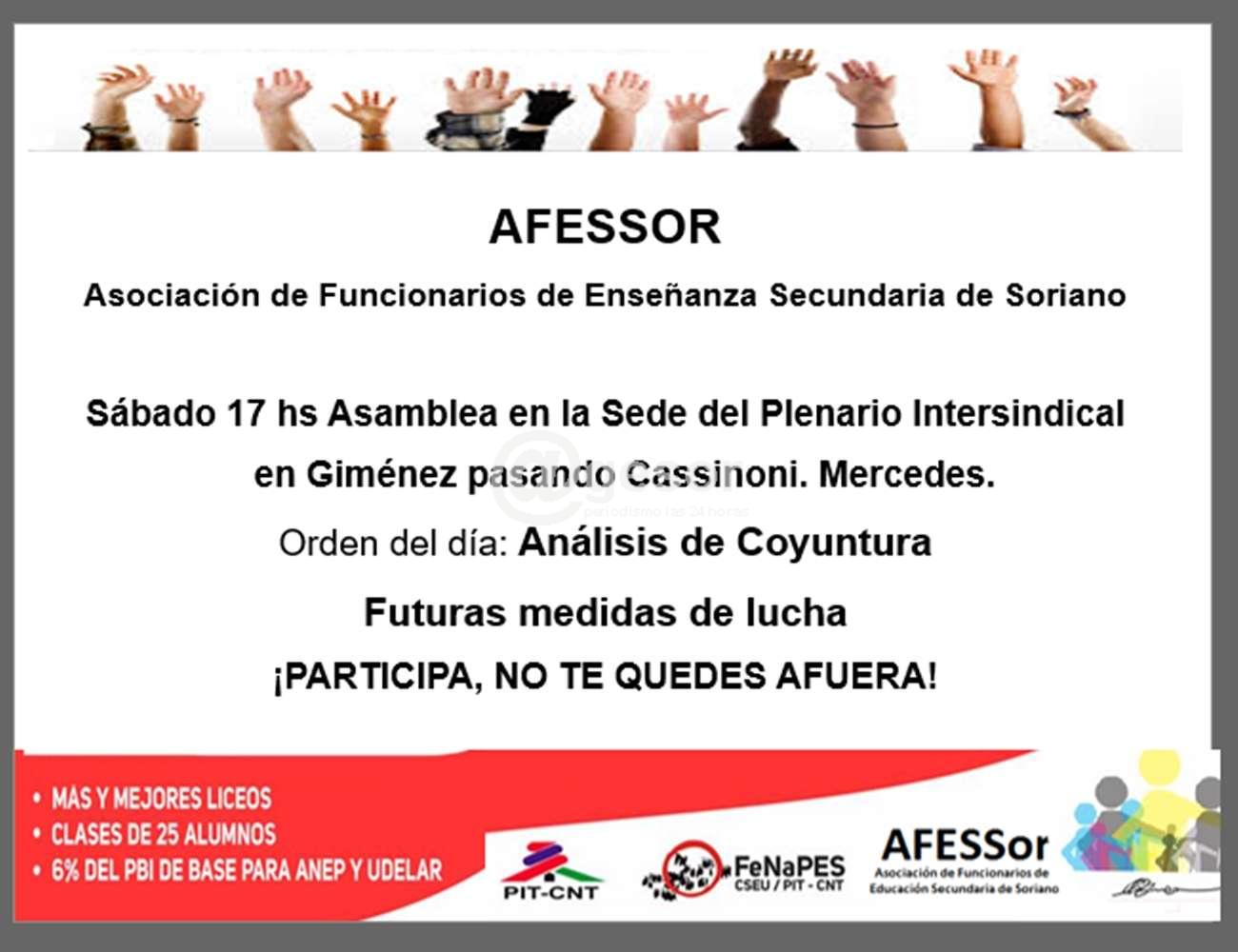 Sábado 17 hs Asamblea en la Sede del Plenario Intersindical en Giménez pasando Cassinoni. Mercedes.