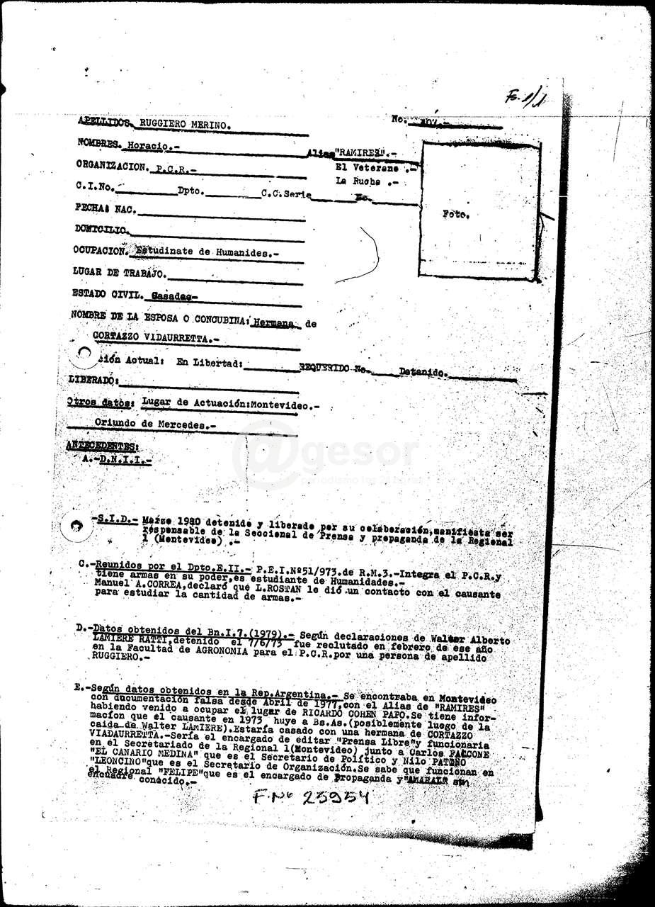 Según informes del Servicio de Información de Defensa (Sid), en 1977 Ruggiero regresó a Montevideo con documentos falsos, aparentemente después de haber quedado “colgado” en Buenos Aires (es decir, sin contactos con miembros de su organización). Desde Montevideo, Ruggiero, que se identificaba con el alias de “Ramírez”, retomó contacto con militantes del Pcr en Mercedes, entre ellos algunos que, habiendo sido presos, estaban bajo libertad vigilada.