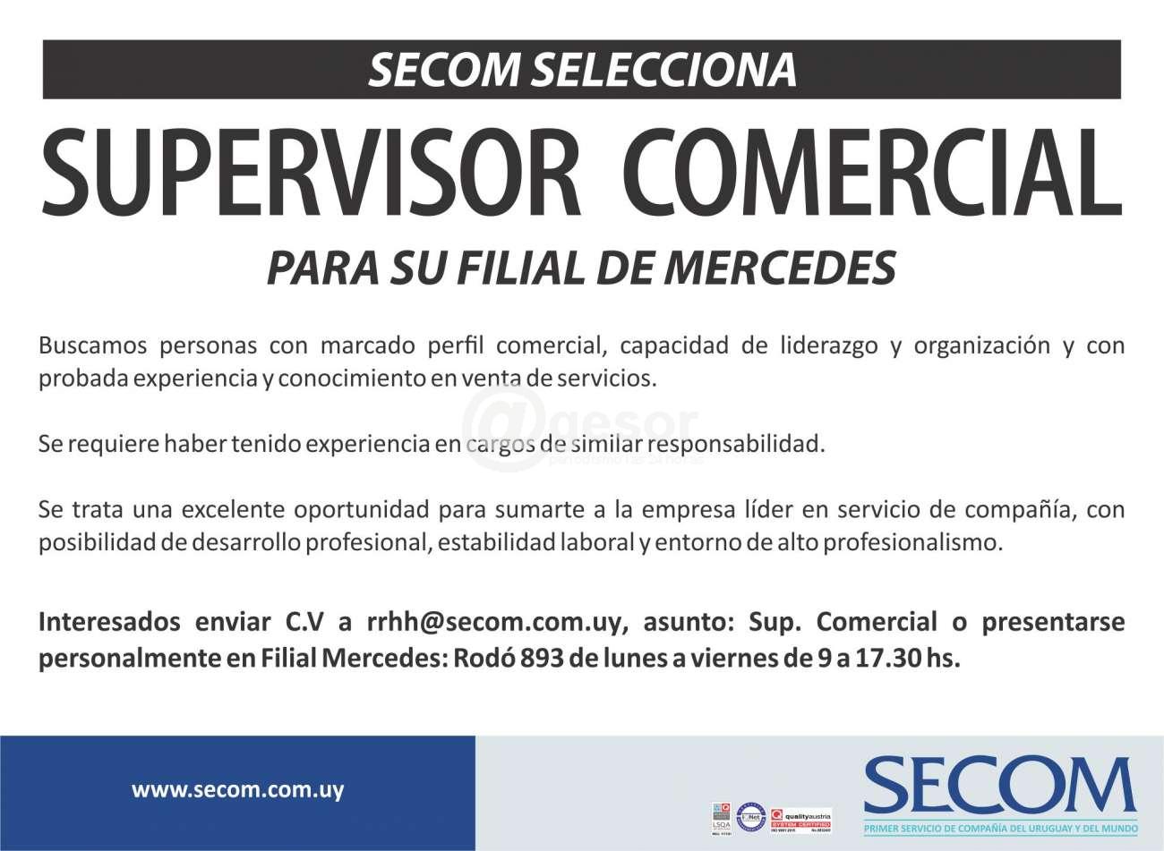Interesados enviar C.V. a rrhh@secom.com.uy, asunto: Sup. Comercial o presentarse personalmente en Filial Mercedes: Rodó 893 de lunes a viernes de 9 a 17.30 hs.