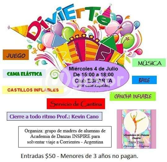 Organizado por el grupo de madres de alumnas de la academia de bailes INSPIRE, propone para el día 4 de julio en el Club Esparta por calle Zapicán, de 15 a 18 horas juegos, cama elástica, castillos inflables, música, baile, cancha inflable. Cierre a todo ritmo con Prof. Kevin Cano. Entradas $50, menores de 3 años no pagan