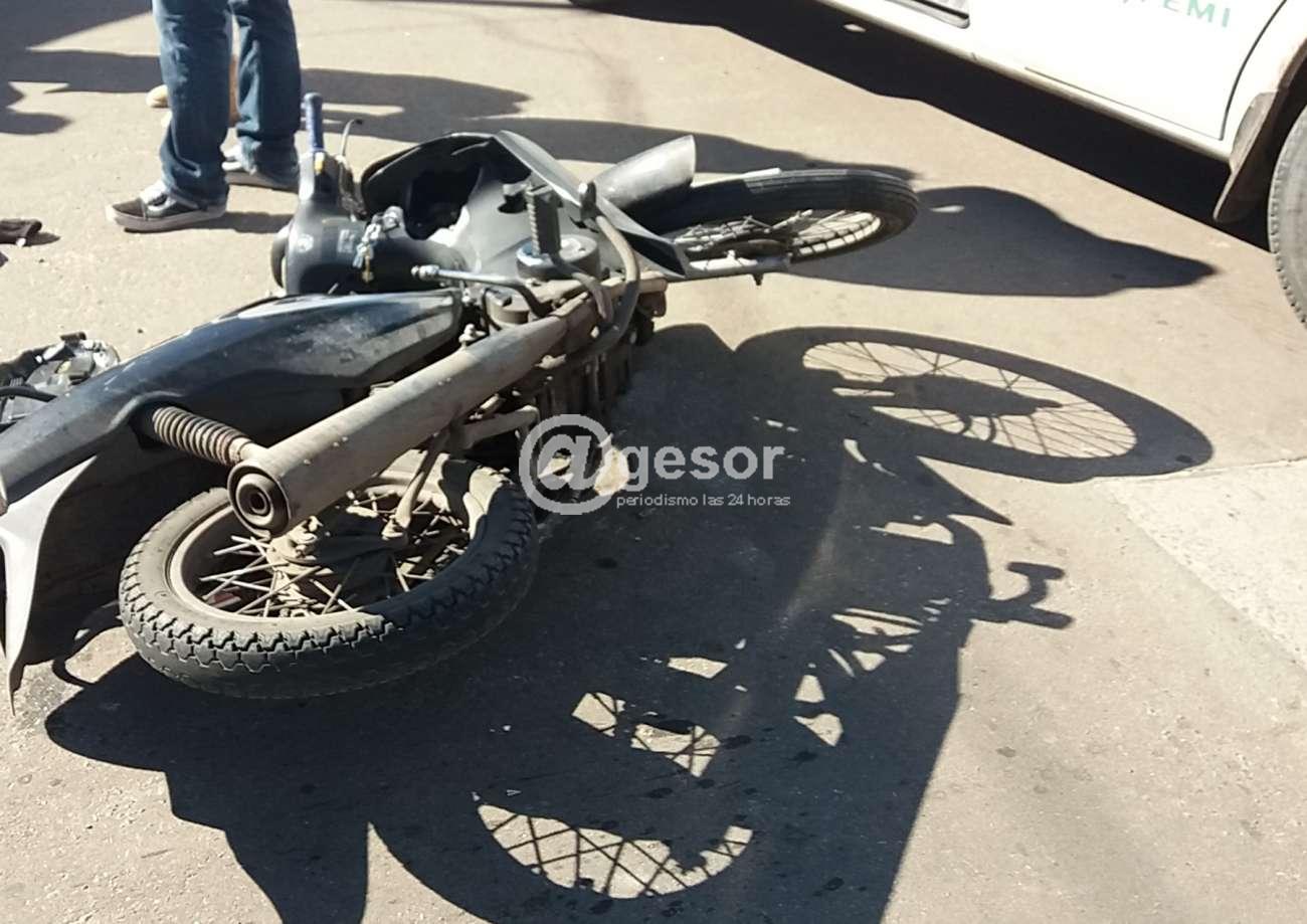 Siniestro de tránsito ocurrió en la intersección de calles Careaga y Oribe, en circunstancias que la moto Yumbo KMG 662 conducida por un masculino de 68 años, circulaba por la primera arteria de mención, cortándosele los frenos, no pudiendo evitar embestir automóvil Chevrolet Corsa NCA 9034, guiado por un masculino de 21 años, el cual circulaba por calle Oribe. En el lugar se hizo presente personal de la Brigada de Tránsito Municipal, realizando prueba de espirometría, dando como resultado 0,0 para ambos conductores, como así ambulancia de EMS quien le certificó al conductor del birrodado fractura expuesta de miembro inferior derecho, siendo trasladado a Sanatorio de CAMS. Se dio trámite a Policía Científica.