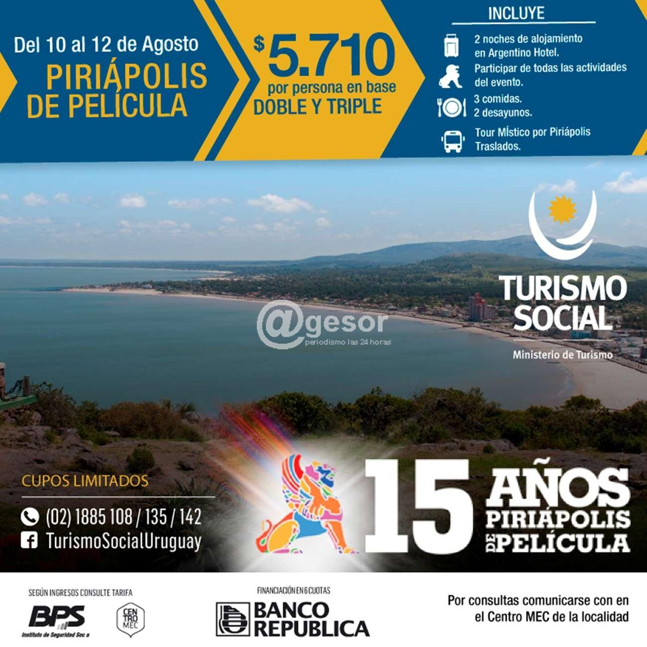 A raíz de esto es que se invita a adultos mayores de Soriano a sumarse a esta actividad, que cuenta con un cupo limitado de pasajeros y que tendrá una duración de 2 días (10 al 12 de agosto ), visitando Piriápolis de Película en la conmemoración de los 15 años del Festival de Cine, donde además se contará con la proyección de películas nacionales y extranjeras de alto nivel , asi como la presencia de famosos actores y productores de cine.