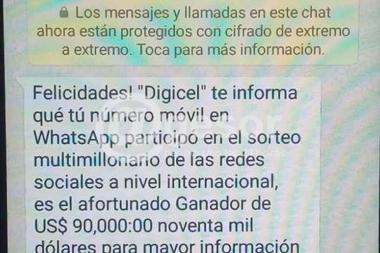 La Sección Delitos Tecnológicos de la Dirección General de Lucha Contra el Crimen Organizado e INTERPOL advierte que en los últimos días ha circulado un mensaje que afirma ser la empresa de telefonía DIGICEL y que su número participa de un sorteo millonario.