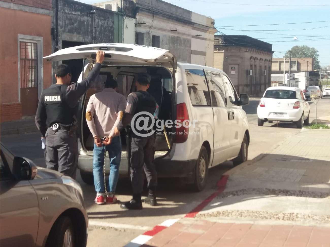 En las fotografías Sebastián Lares Pereira de brazos cruzados y atrás su compinche que este es su primer antecedente, el ábado siguiente a cometener el hecho, y en la otra foto momento en que es retirado de la sede judicial.