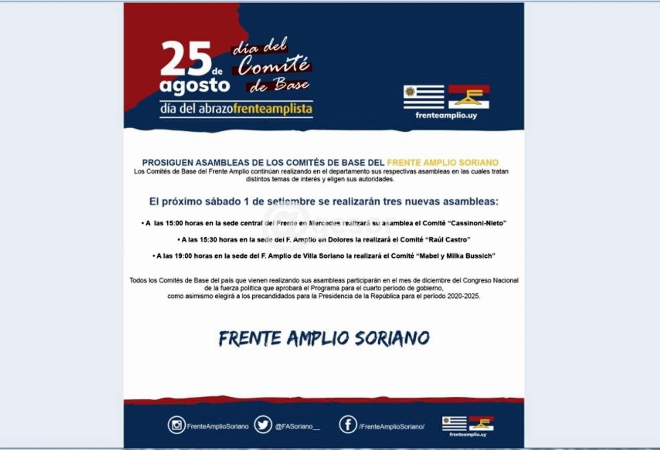 Los Comités de Base del Frente Amplio continúan realizando en el departamento sus respectivas asambleas en las cuales tratan distintos temas de interés y eligen sus autoridades. El próximo sábado 1 de setiembre se realizarán tres nuevas asambleas: