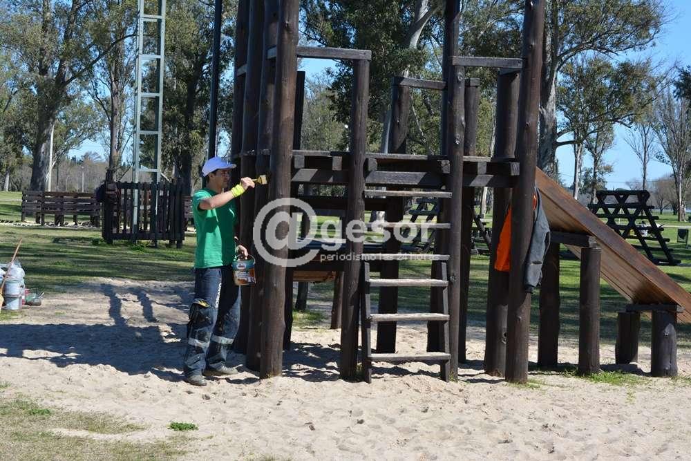Allí se efectuó la recuperación de los juegos confeccionados con troncos, reponiendo piezas faltantes, ajustando las estructuras y aplicando barniz en ellas.