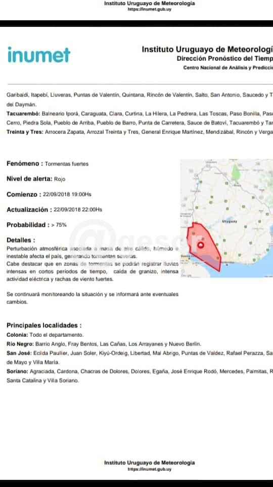 Rige desde la hora 19.00 y afecta los departamentos de Colonia, Río Negro, San José, Soriano.