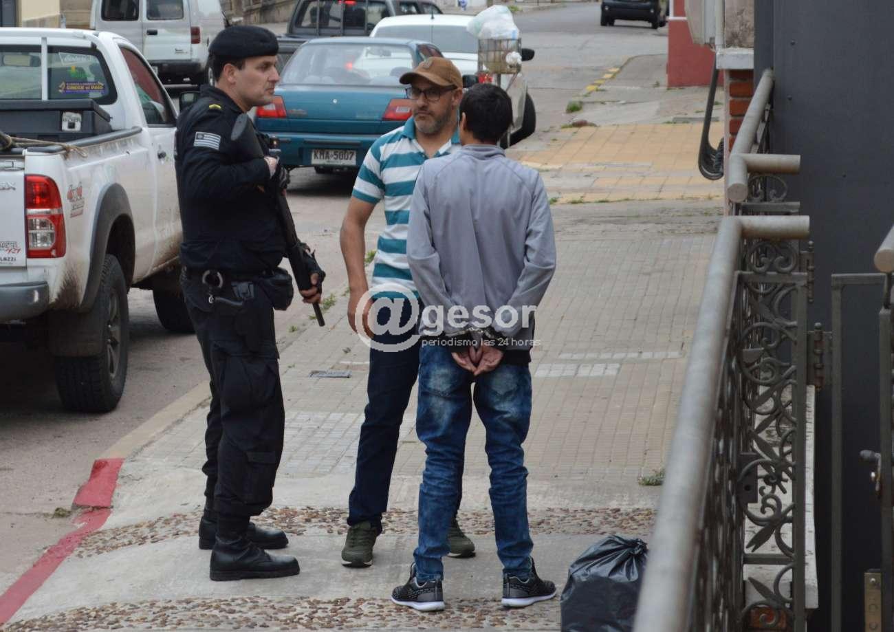 En el momento acertaba pasar frente al local M.B.M. funcionario policial de Florida, quien se percata de las características del delito y ve el arma que portaba uno de los imputados y
