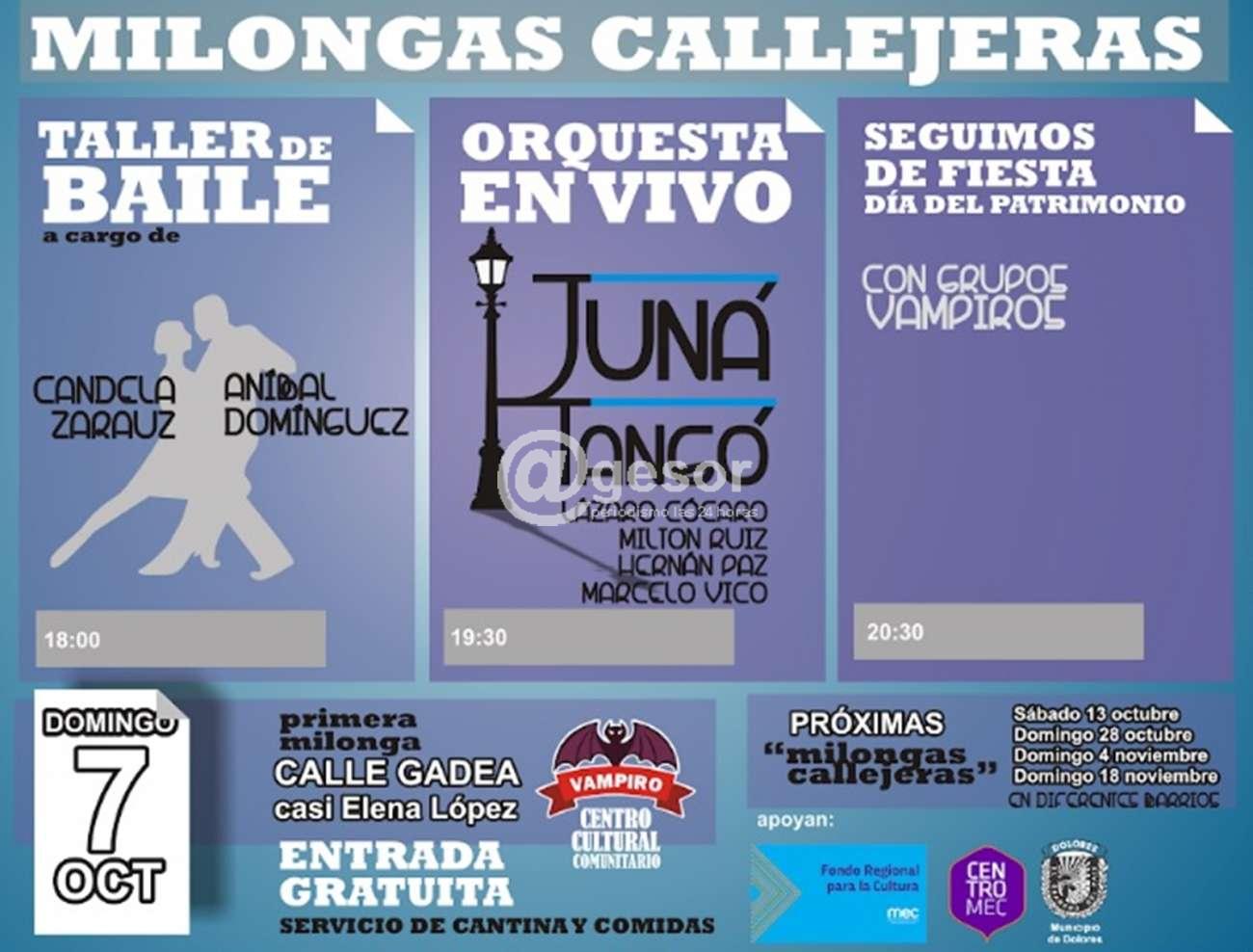 La Agenda Cultural continúa el domingo 7 en la calle del Vampiro, Gadea casi Elena López, festejando el Día del Patrimonio con una Milonga Callejera y tablado con varios artistas vampiros. Comienza a las 18.00 con taller y demostración de baile de tango a cargo de Candela Zarauz y Aníbal Domínguez, a las 19.30 se presenta el grupo de tango Juná Tangó y continúa con la presentación de Grupos Vampiros de rock, percusión, murga, candombe y más.