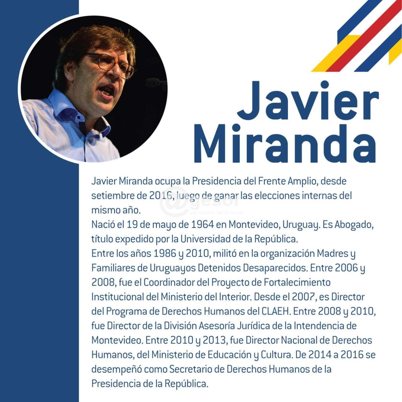 Javier Miranda ocupa la Presidencia del Frente Amplio, desde setiembre de 2016, luego de ganar las elecciones internas del mismo año.