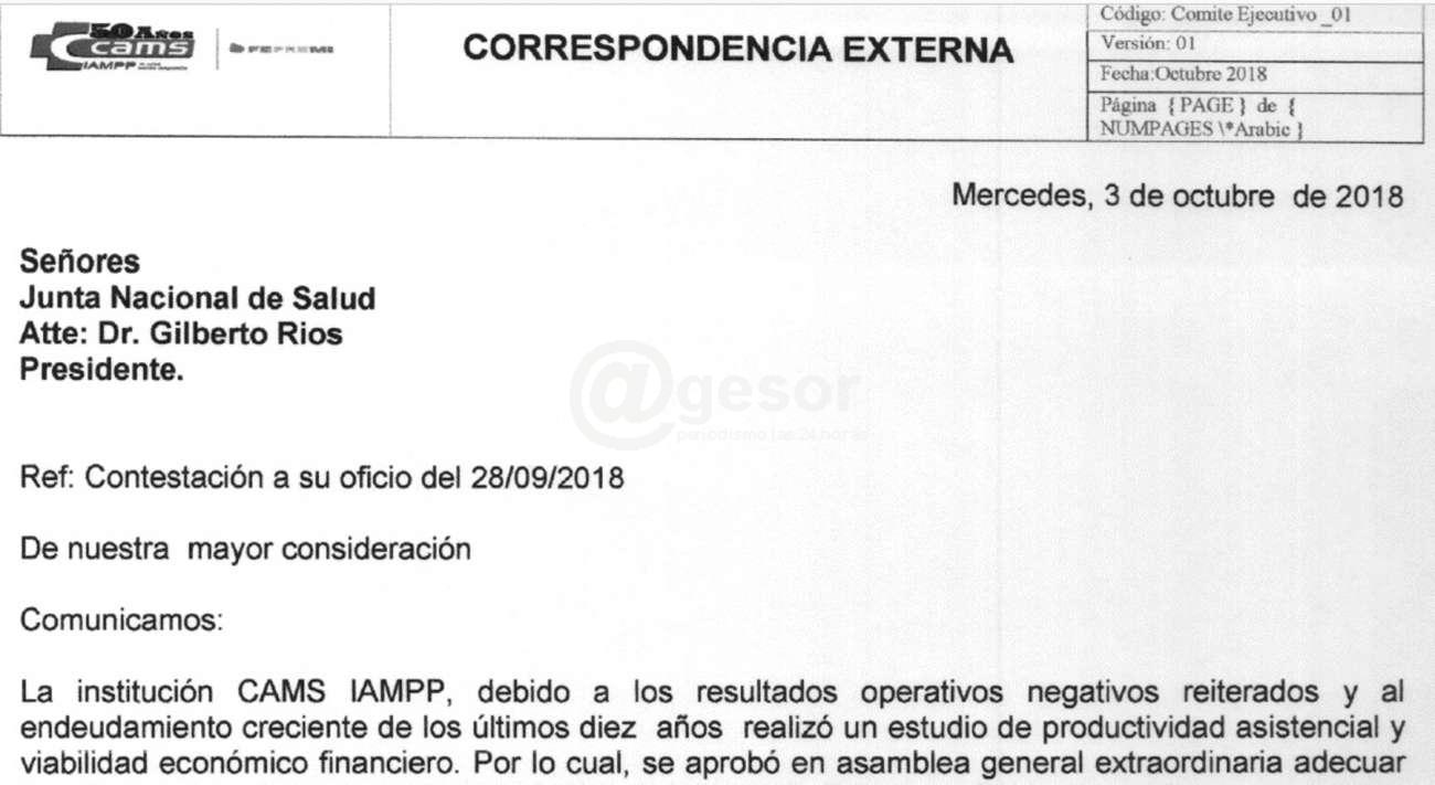 A ello con fecha 3 de octubre la directiva de CAMS le respondió con la firma de su Presidente Dr. Arturo Méndez y Secretario Dr. Germán Labella, que "debido a los resultados operativos negativos reiterados y al endeudamiento creciente de los últimos diez años realizó un estudio de productividad asistencial y viabilidad económico financiero. Por lo cual, se aprobó en asamblea general extraordinaria adecuar los niveles de asistencia en las Unidades ejecutoras de Dolores y Cardona en forma progresiva pudiendo llegar hasta un primer nivel de atención".