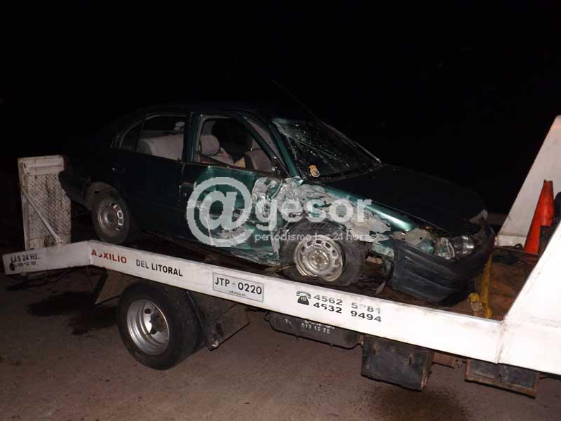 (por Martín Corujo) Este domingo sobre las 20:50 horas un auto protagonizó un accidente de tránsito a la altura del kilómetro 356.500 de la ruta 21, al cruzarse de senda y terminar impactando contra la estructura del puente sobre el Arroyo Dacá, a escasos kilómetros de la ciudad de Mercedes. Se trata del automóvil Toyota Tercel, IAA 4787, que se dirigía de sur a norte, rumbo a Mercedes, conducido por Juan Noguera de 34 años, quien iba acompañado por su esposa Silvia Leyba y sus dos hijos de 7 y 9 años, todos de Paysandú.