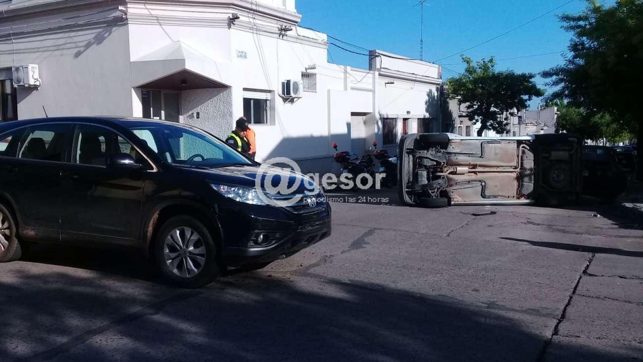 En la mañana de este jueves se produjo siniestro de tránsito en la intersección de calles Oribe y Ferrería que a pesar del vuelco de uno de los vehículos no se registraron lesionados. Por Oribe de Sur a Norte circulaba la camioneta Renault matrícula KMA 3890 mientras que por Ferrería lo hacía el vehículo Honda, conducida por A. Saratsola, de Oeste a Este, cuyo conductor dijo haber sido encandilado por el sol y no haber podido apreciar que aparecía a su derecha el otro vehículo, que por circunstancias que se procuran establecer, termina volcando y quedando de costado. El vehículo que volcó llevaba un solo ocupante, A. Clavero, que resultó sin lesiones, saliendo por sus propios medios.