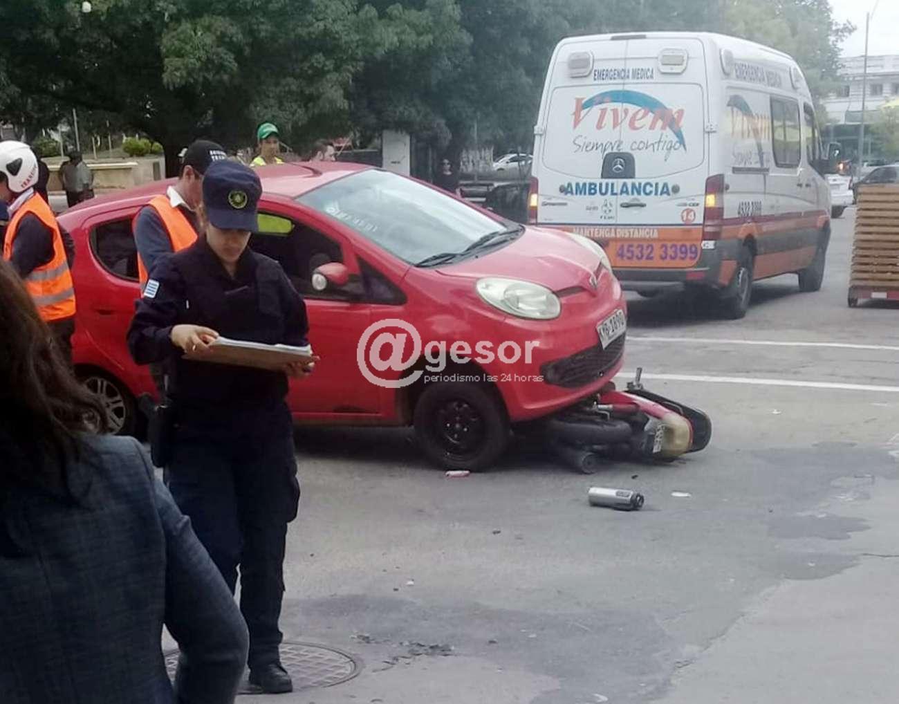 Minutos antes del mediodía de este jueves se produjo siniestro de tránsito cuando por calle Giménez de Este a Oeste circulaba moto conducida por Tania Ramírez, mientras que por Artigas de Sur a Norte lo hacia el automóvil guiado por Natalia Rey.