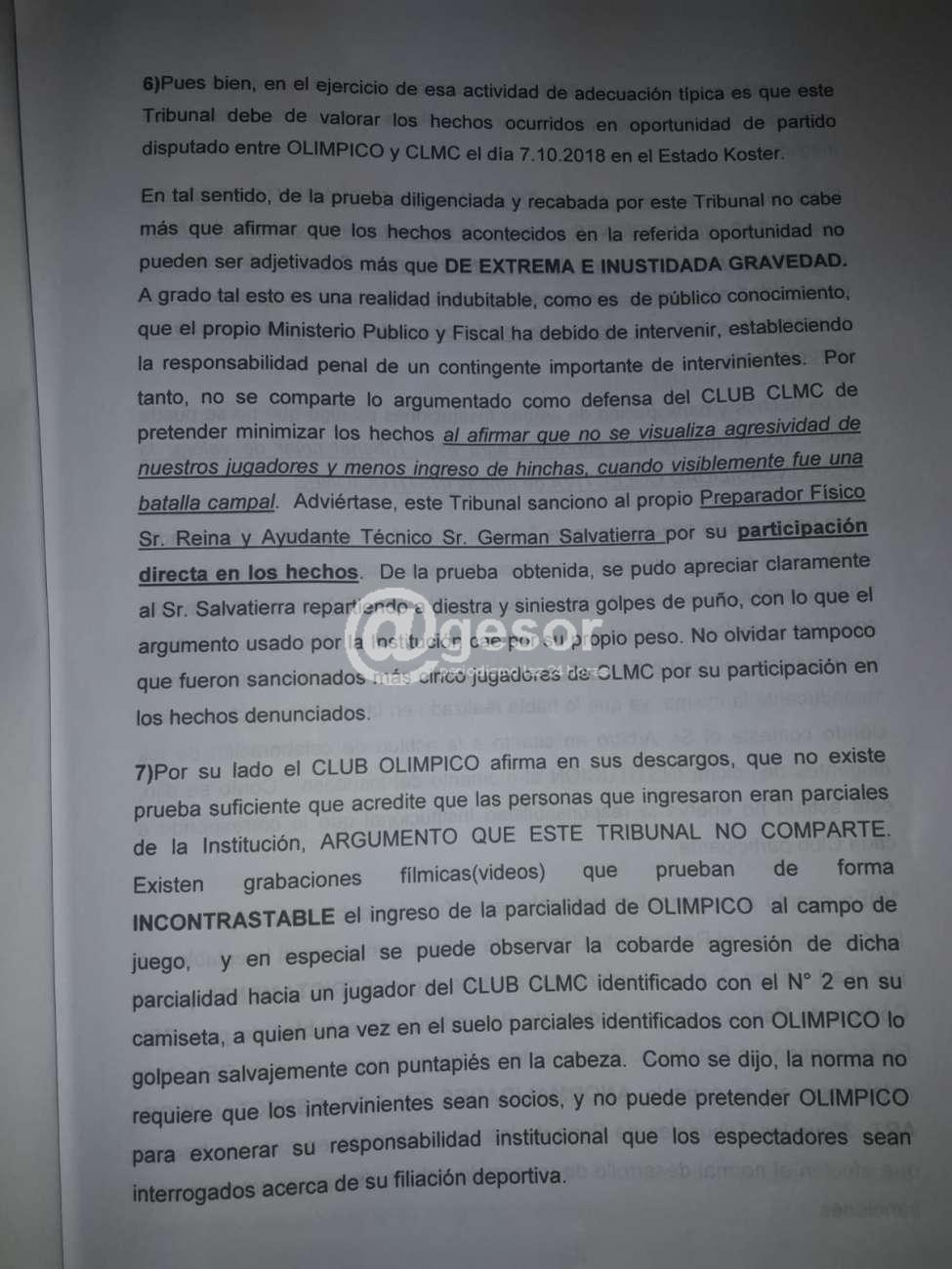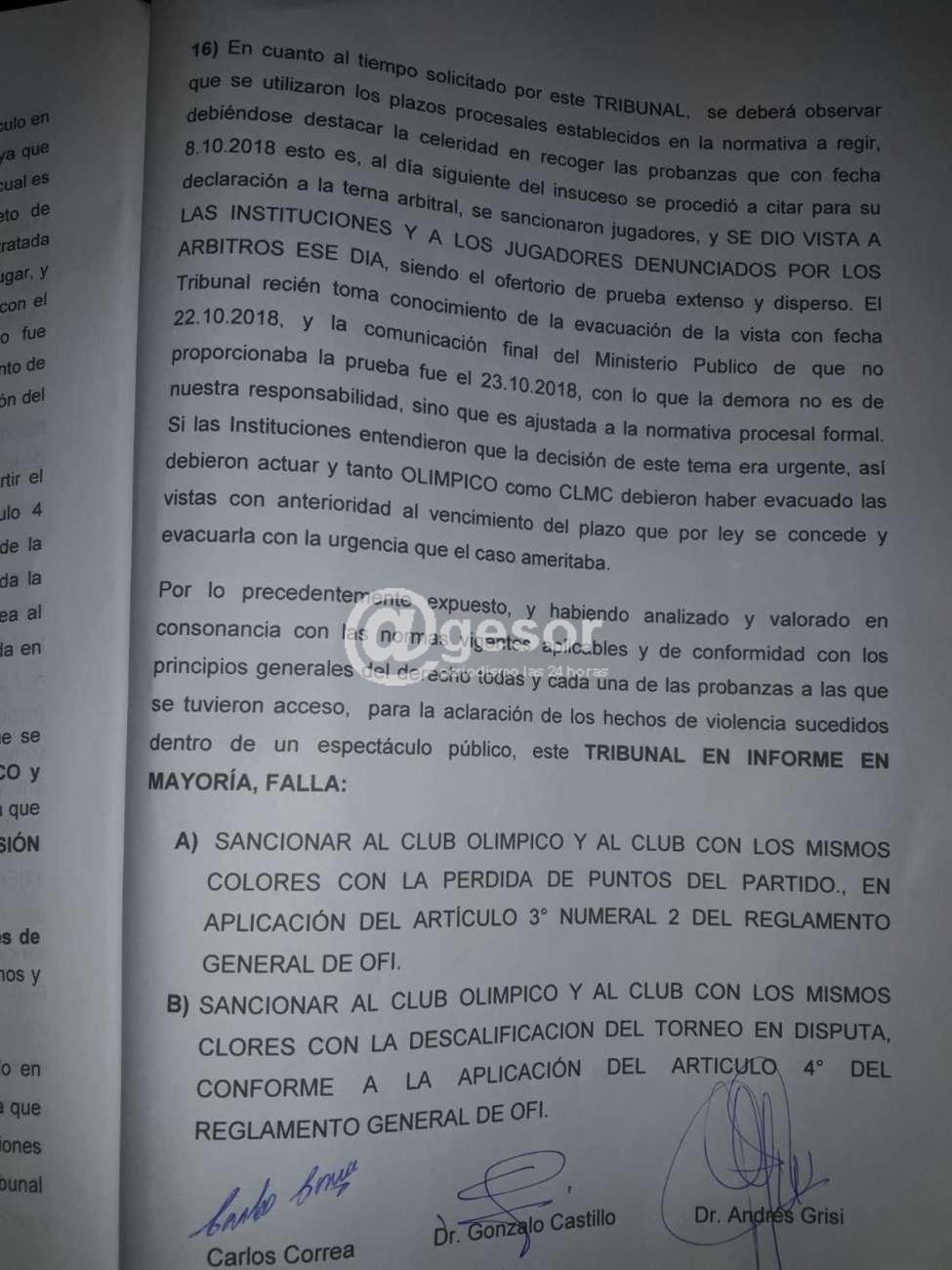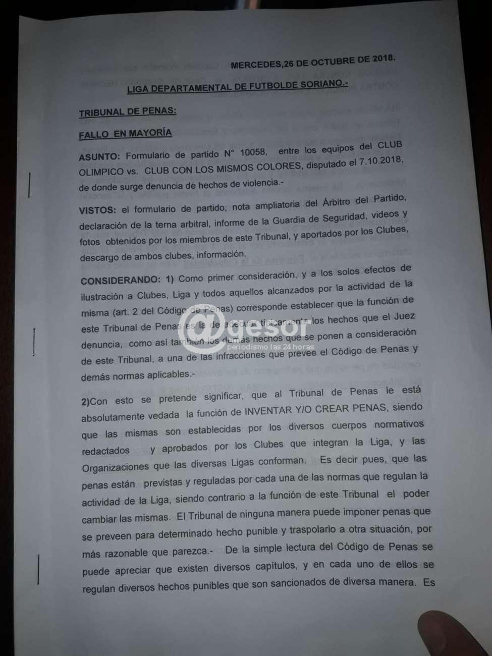 Ofrecemos el texto completo a través de fotografías, del informe firmado por tres integrantes de los cuatro del Tribunal de Penas de la Liga de Fútbol de Mercedes, que fallan sancionando con la descalificación a los clubes Olímpico y Con Los Mismos Colores.