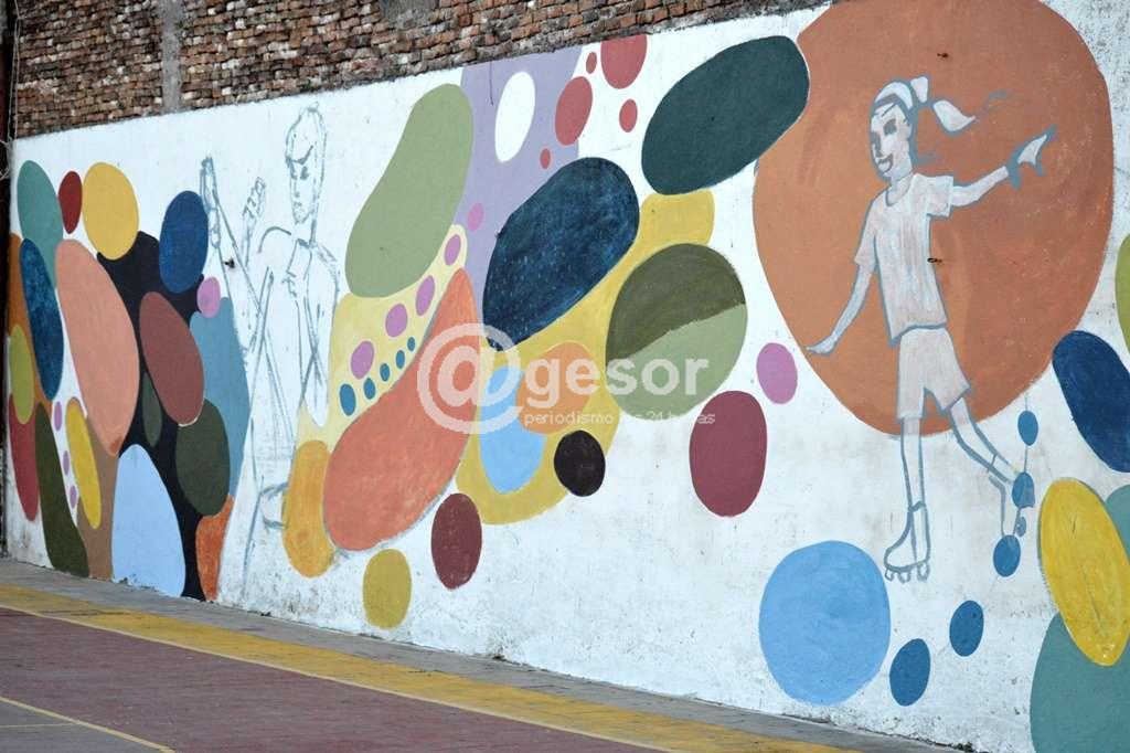En este caso se trata de un mural relacionado con las actividades que esta teniendo el Centro Papeleros gestionados por su comisión, junto al SUNCA, como patín artístico, fútbol, basquetbol, taekwondo.