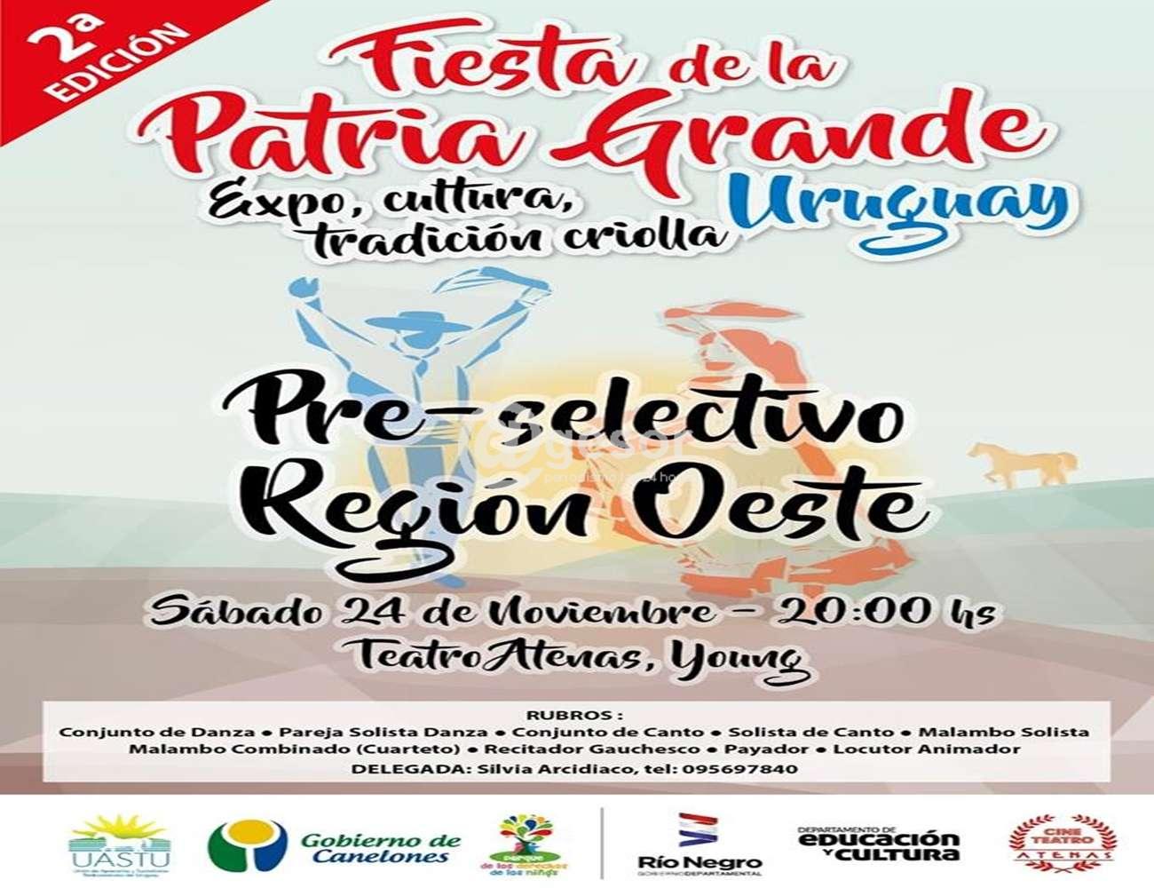 La Zona Oeste abarca los departamentos de Río Negro, Soriano, Flores y Colonia, siendo la delegada la Sra. Silvia Arcidiaco, realizándose la preselección el día 24 de noviembre a partir de las 20 hs en el Teatro Atenas de la localidad de Young, departamento de Río Negro.