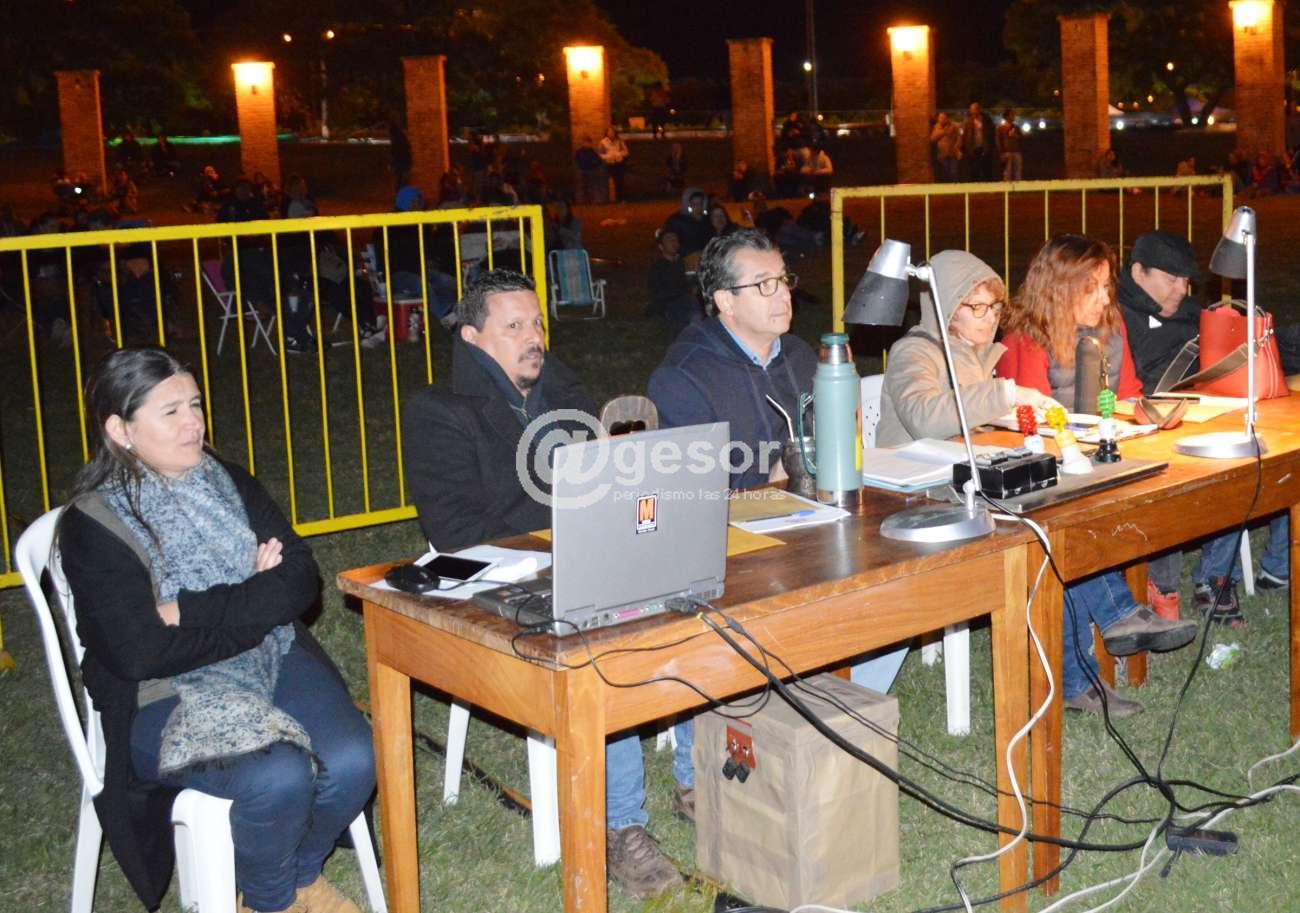El jurado, con abrigo para una noche parecida a una invernal, se estableció frente al escenario, este año con la incorporación con un hombre de Carnaval, como Jorge Del Pino, mantiene a los demás integrantes, Mario Capdevila, Marcelo Esquivel, Rosario Echeverría y Teresita Píppolo.