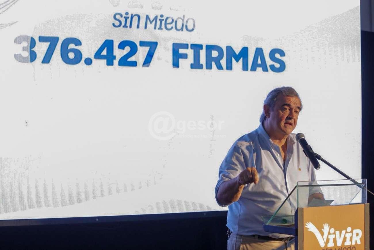 Allí anunció que se llegaron a las firmas requeridas por la Constitución de la República para habilitar el plebiscito (se requerían 272.000 firmas) y además que se superaron por más de 100.000, contando “al día de hoy con 376.472 firmas, por tanto hay plebiscito”.