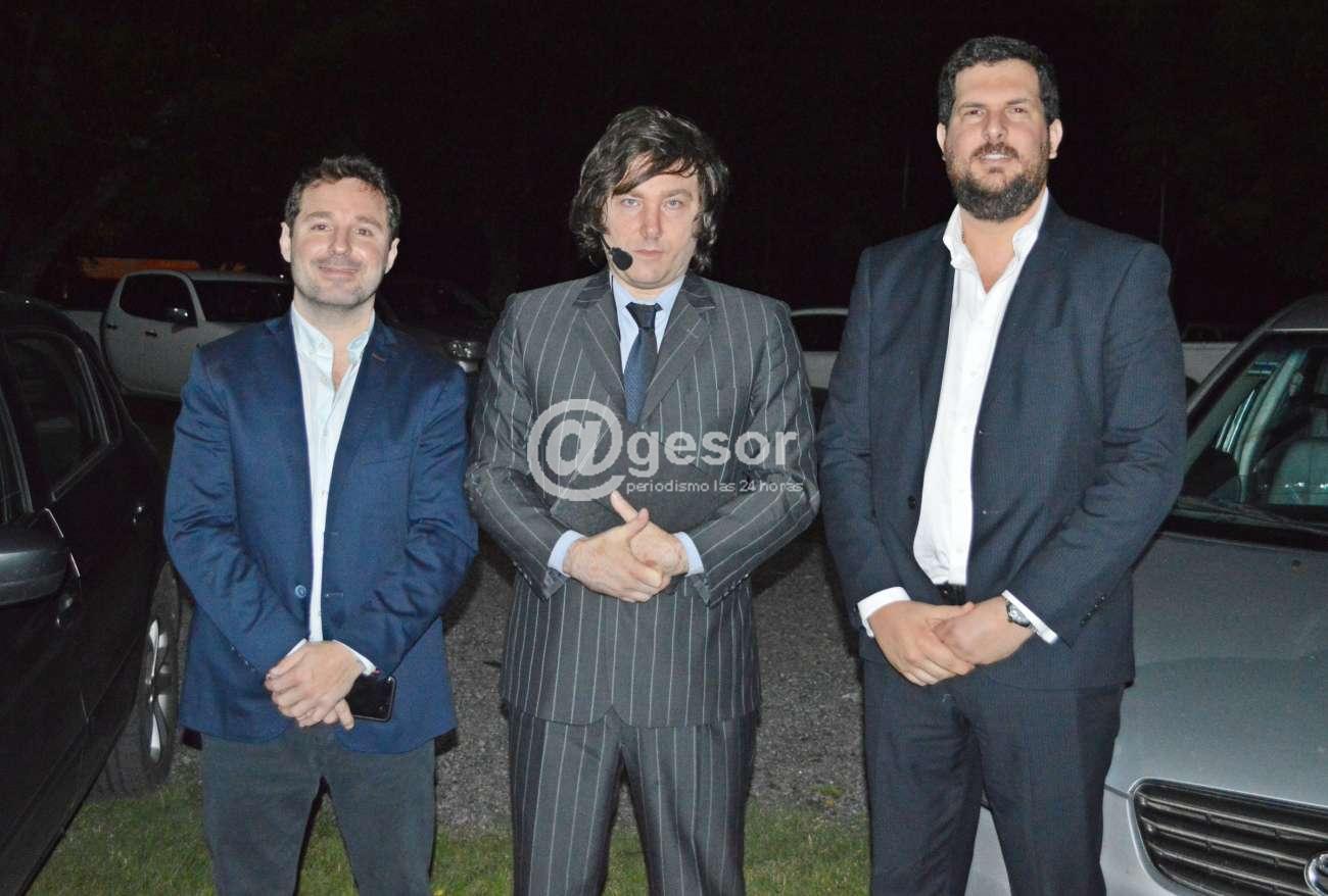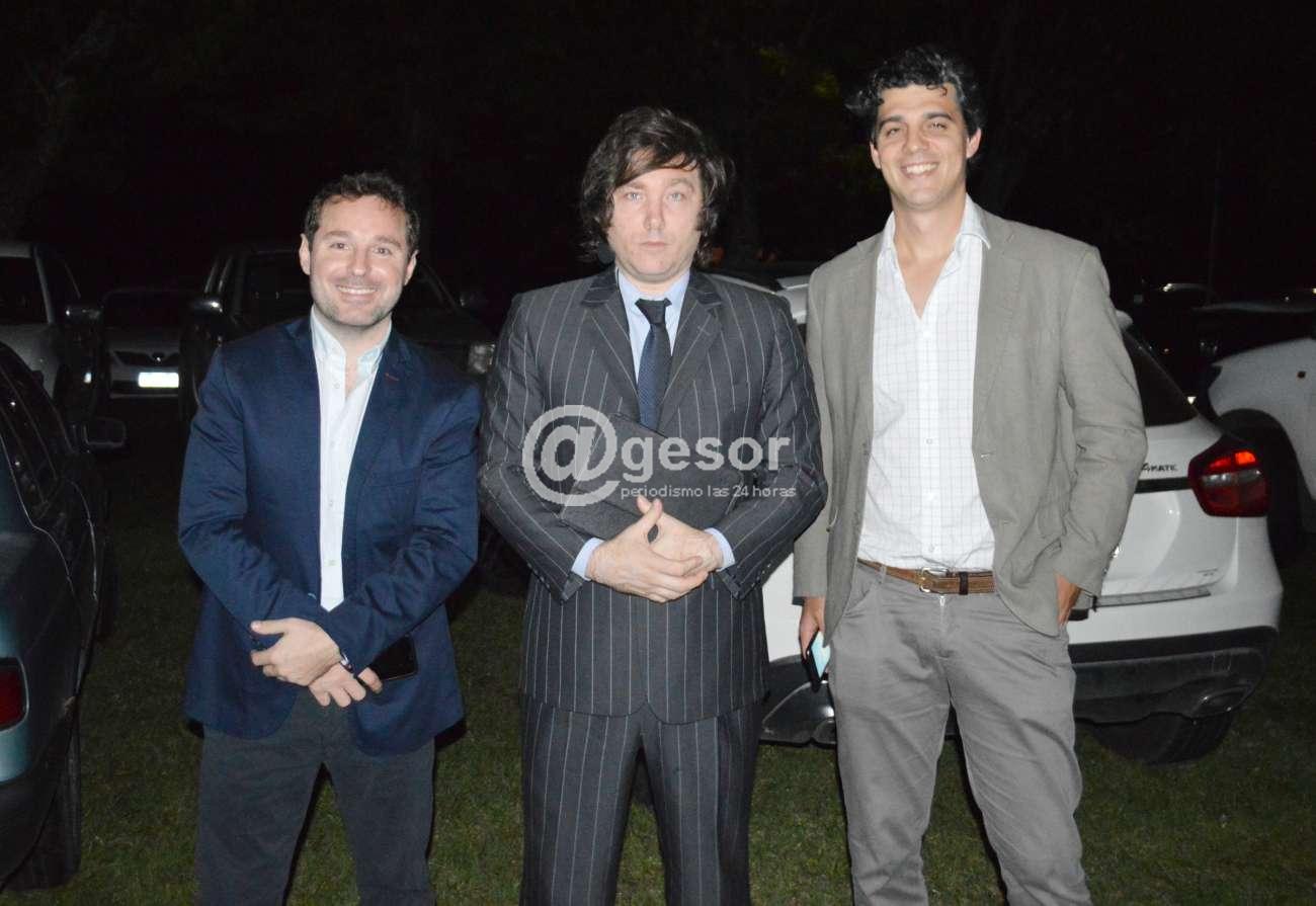 En la fotografía central, el Ec. Javier Milei, flanqueado por dos de los integrantes del Directorio de Del Río, Dres. Bruno Gandolfo y Daniel Piedra momentos antes de iniciarse la presentación.