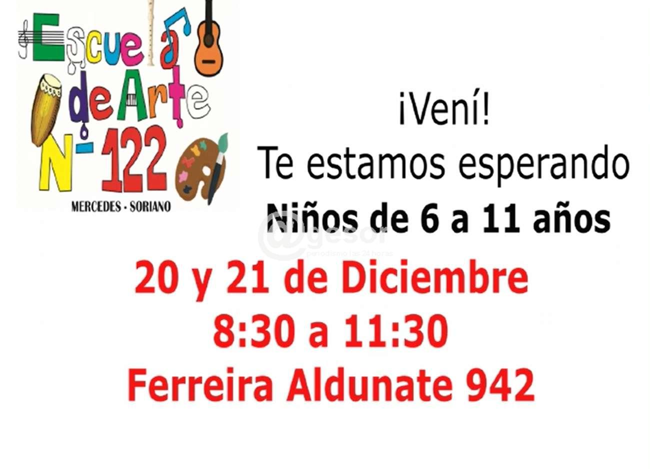 Escuela de Educación Artística N 122 de Educación Primaria comunica que se encuentra abierto el periodo de inscripción para alumnos de 6 a 11 años de edad que concurran a Escuelas públicas del departamento. Las asignaturas que se imparten son: Artes Visuales, Expresión por la Voz, Trompeta, Piano y Guitarra.