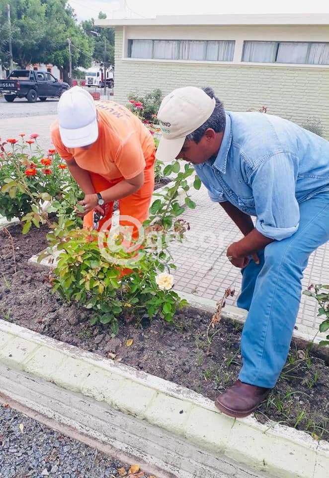 La tarea es realizada por funcionarios municipales, algunos integrantes del grupo de jardinería y vecinos, con el asesoramiento del idóneo en rosales Esteban Erricalde.
