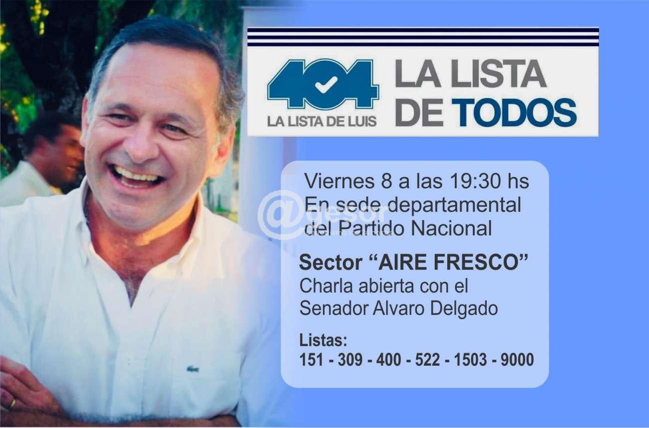 ESTE VIERNES 8 LISTA 404 DEL PARTIDO NACIONAL, SECTOR "AIRE FRESCO" QUE APOYA LA CANDIDATURA DE LUIS LACALLE POU, INVITA A CHARLA ABIERTA EN LA SEDE DEPARTAMENTAL JUNTO AL SENADOR ALVARO DELGADO A LAS 19.30 HORAS