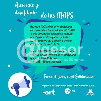 El Equipo de Representación de los Trabajadores (ERT) en el BPS recuerda que hasta el 31 de marzo próximo tienen plazo los mayores de 56 años para desafiliarse de las AFAPs, si así lo desean.