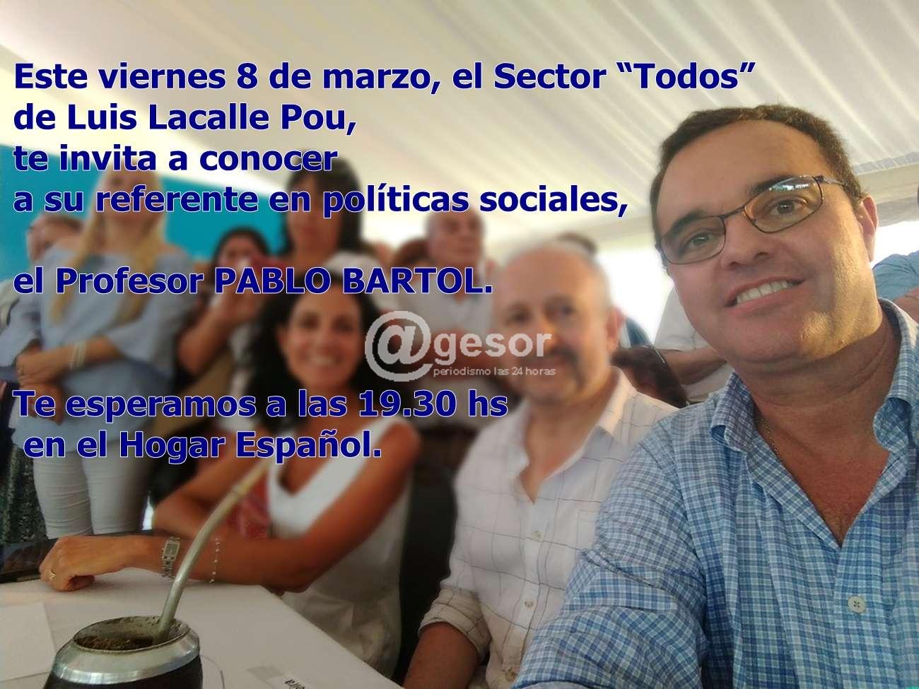 Este viernes 8 de marzo, el Sector “Todos” de Luis Lacalle Pou, te invita a conocer a su referente en políticas sociales, el Profesor PABLO BARTOL.