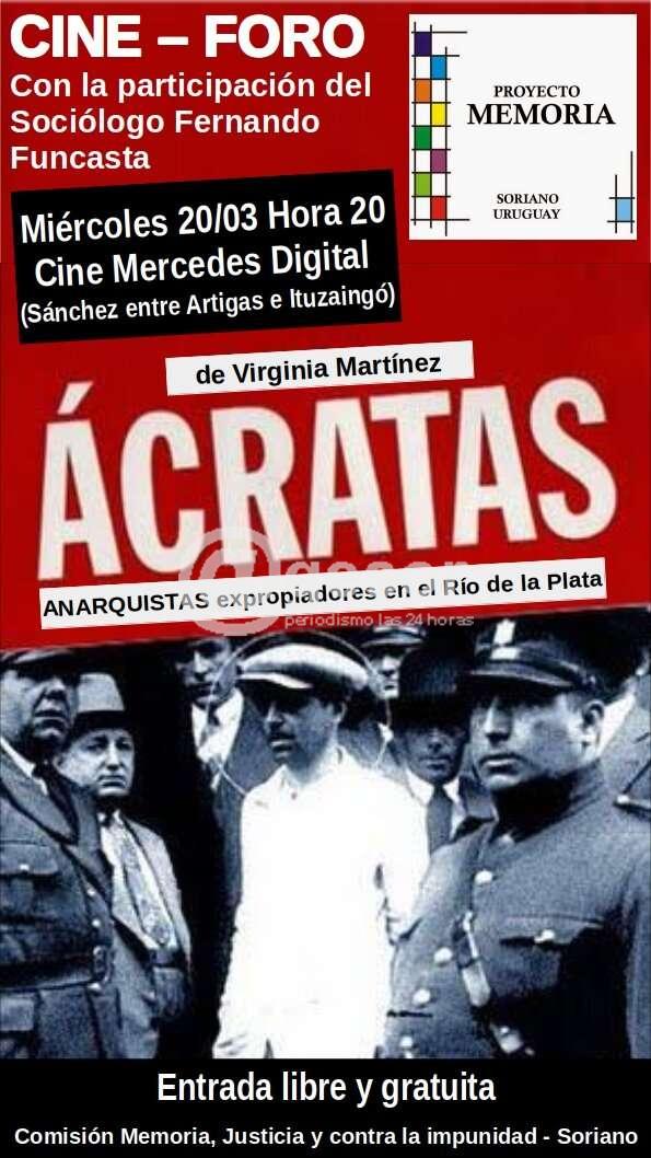 Este miércoles a las 20 horas, en Cine Mercedes Digital se proyectará “Ácratas, anarquistas expropiadores en el Río de la Plata” una película de Virginia Martínez. Esta nueva velada de Cine-Foro es organizada por la Comisión Memoria y contra la impunidad de Soriano, contándose con la participación del Sociólogo Fernando Funcasta.