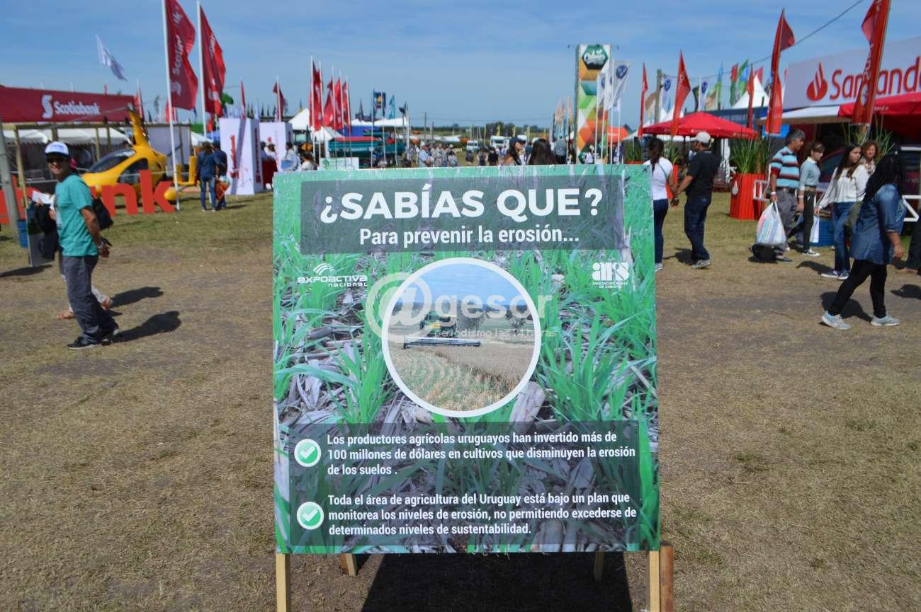 A pocos metros de traspasar el ingreso principal a Expoactiva Nacional, se podía apreciar en medio de una de las calles centrales seis paneles con doble lado en los que se habían colocado carteles en los que se brindaba información sobre la muestra y el sector agropecuario en general, relacionados con aportes que realiza el sector y los productores en particular a aspectos relacionados con la economía del país.