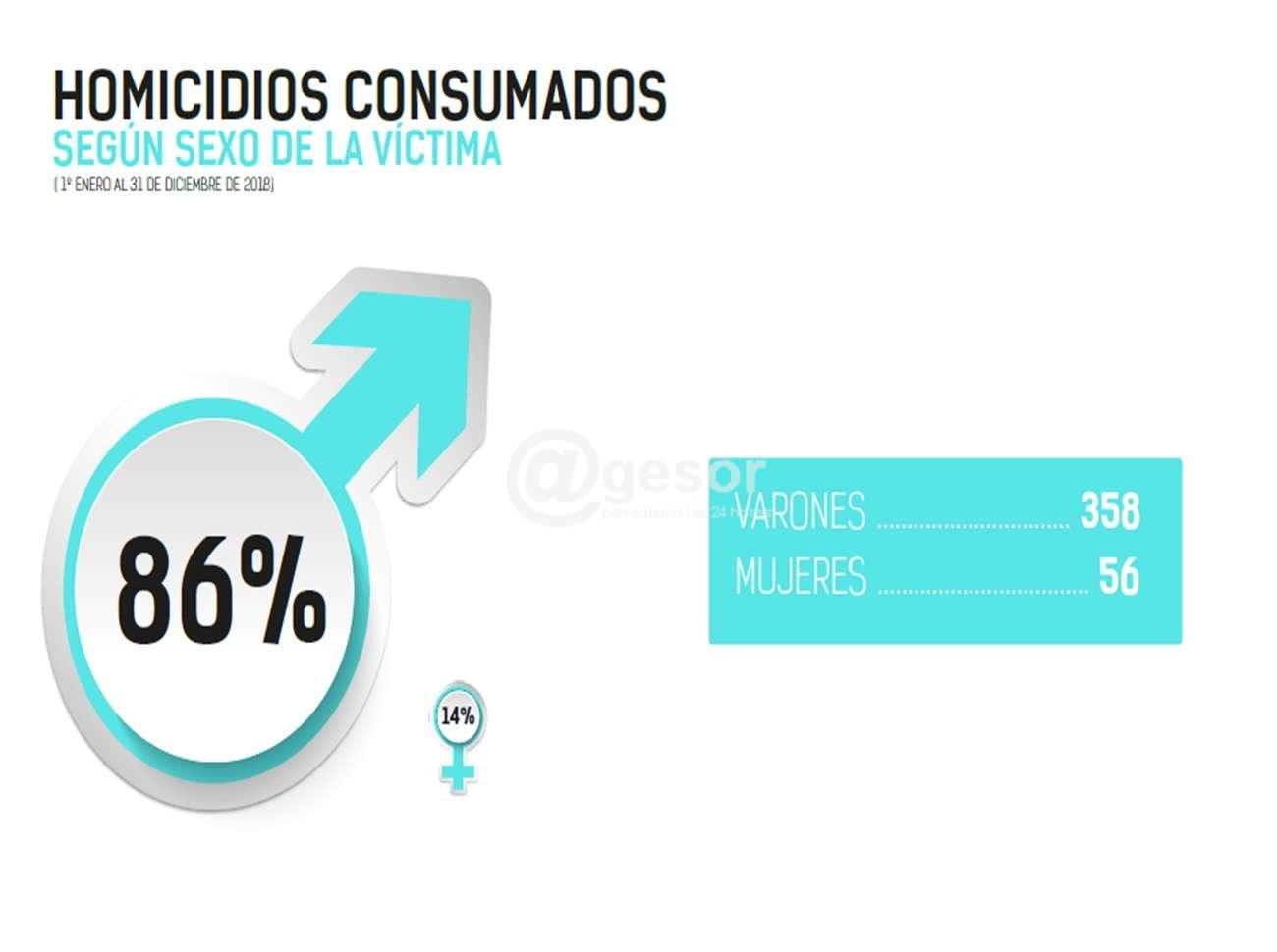 Este aumento eleva la tasade homicidios cada 100 mil habitantes a 11,8. El uso de arma de fuego sigue siendo una variable de alta incidencia en la ocurrencia de los mismos, registrando un total de 296 homicidios cometidos mediante su empleo, un guarismo del 74% mayor al del año 2017 que fueron 170 casos.