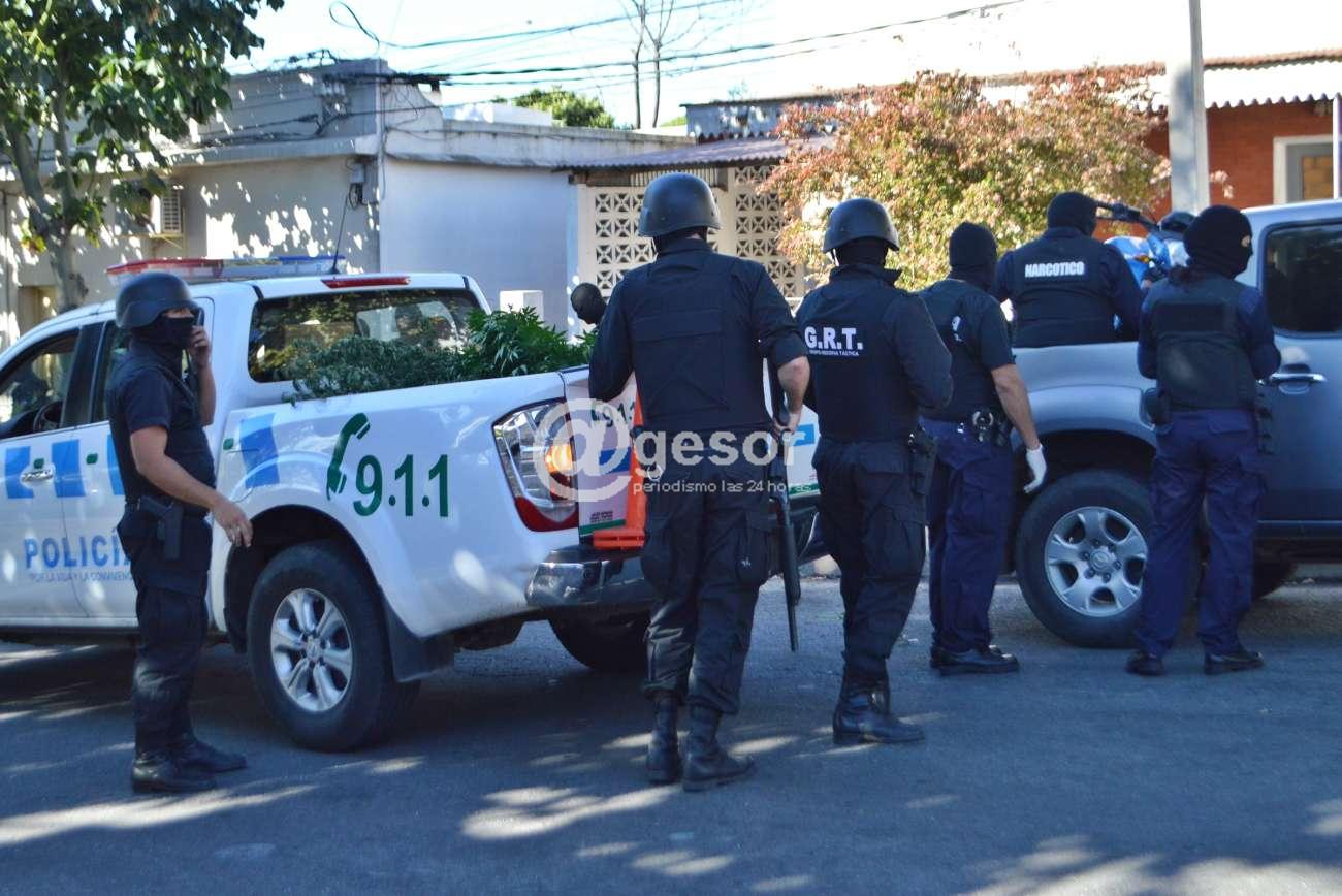 Del lugar se llevaron dos personas detenidas, además se incautó arma de fuego, plantas de marihuana, una moto y otros elementos.