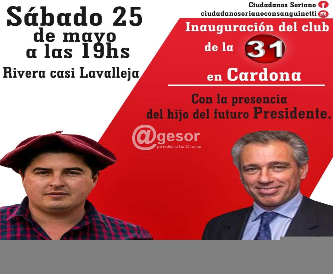 El acto se comenzará a las 19 horas, en el local ubicado en calle Rivera casi Lavalleja de Cardona. En la oportunidad hablarán el edil Leonel Silva, y Julio Luis Sanguinetti, hijo del ex Presidente y actual pre candidato presidencial Julio María Sanguinetti.