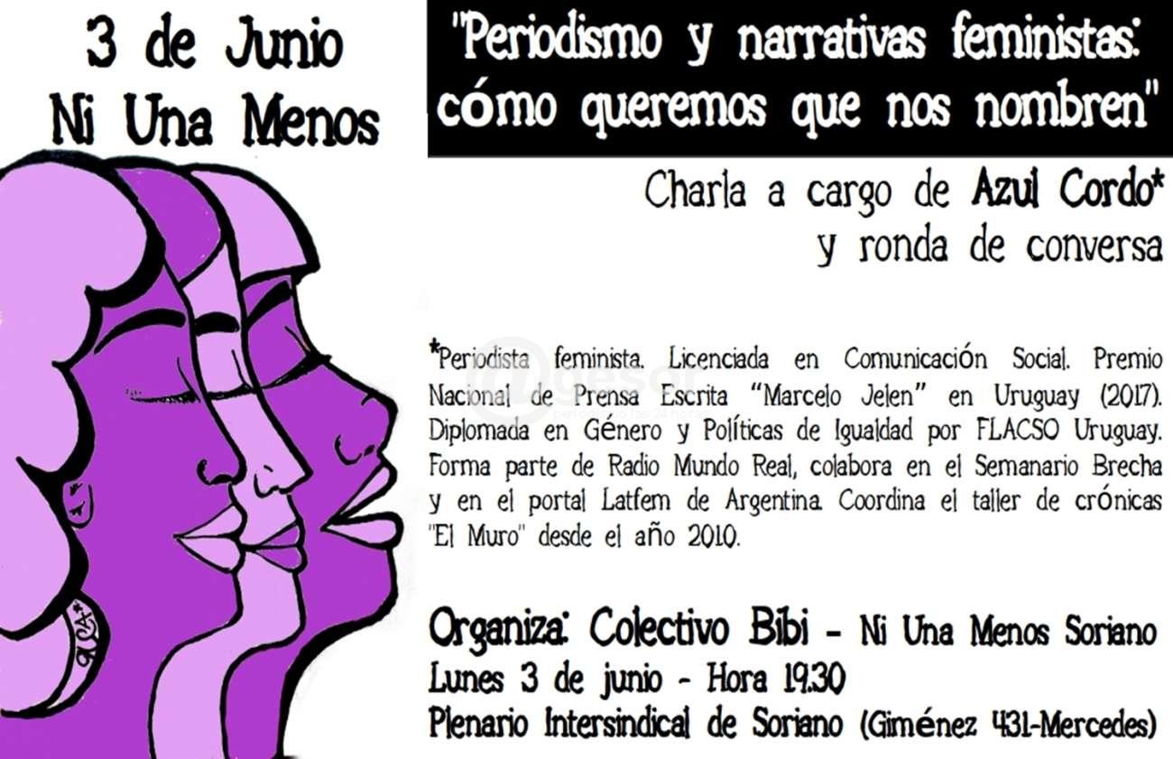 El Colectivo Bibi- Ni una menos  de Soriano  organiza para  este lunes  3  de junio  una charla  a  cargo de  la periodista  Azul Cordo.   El  título  de la  misma  será “Periodismo y narrativas feministas: cómo queremos que nos  nombren”.