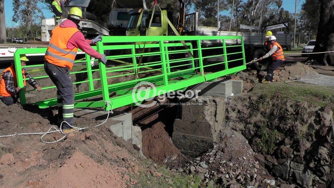 Este viernes, utilizando grúas se procedió a instalarlos sobre las fundaciones construidas previamente, las que debieron ser afirmadas, conformándose nuevos taludes con piedra de modo de frenar el proceso erosivo en las cabeceras debido a las crecientes del río.