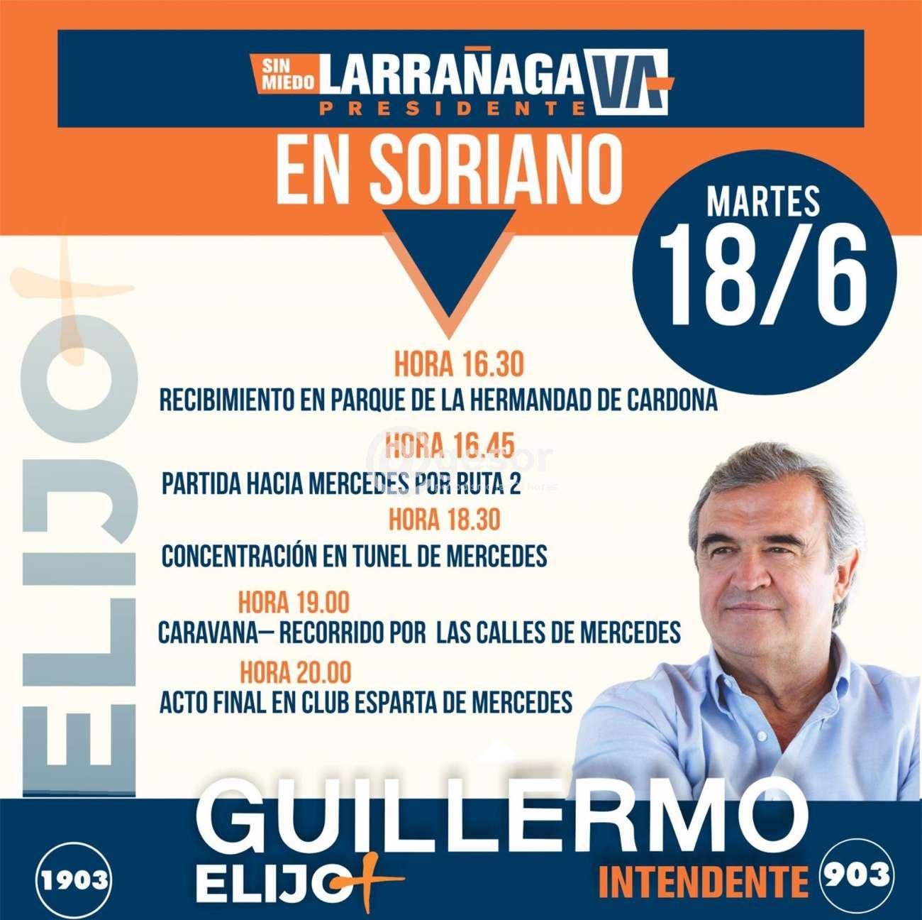 Este martes 18, el precandidato nacionalista Jorge Larrañaga llega a Soriano, arribando a las 16.30 horas al Parque de la Hermandad en Cardona, de allí a las 16.45 iniciará su marcha por Ruta 2 hacia Mercedes, donde a las 18.30 está invitándose a concentrarse en la zona del Túnel en accesos a la capital sorianense. A las 19.00 se iniciará caravana por las calles de Mercedes y a las 20.00 será el acto público en instalaciones del Club Esparta.
