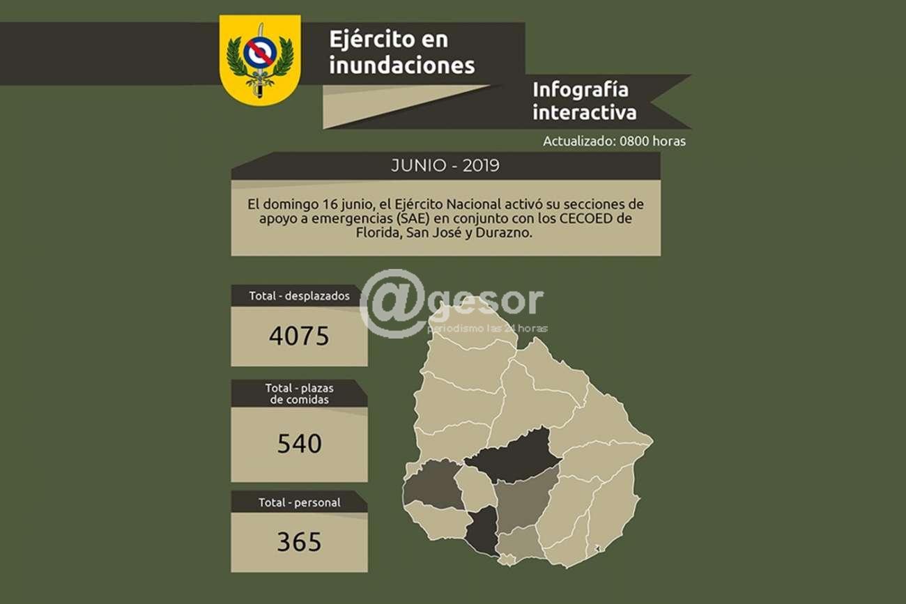 Cuarenta efectivos del Batallón N° 5 “Asencio” fueron destinados auxilio de familias afectadas por la creciente del río Negro en Mercedes. Cuando continúa descendiendo el nivel del río y se espera que comience a activarse el operativo retorno el Ejército Nacional realizó un informe del personal destinado al trabajo de apoyo al Sistema Nacional de Emergencia en los diferentes departamentos. Como se sabe en el pico de la creciente llegaron a haber 7272 personas desplazadas de sus hogares, producto de la crecida de ríos y arroyos. En esa tarea de auxilio y apoyo el Ejército nacional destinó 402 de sus efectivos como apoyo a ese trabajo desplegado en varios departamentos, que trabajaron desde el 16 de junio pasado en Soriano, Durazno, Treinta y Tres, Florida, Maldonado, Rocha, Colonia, San José y Flores.