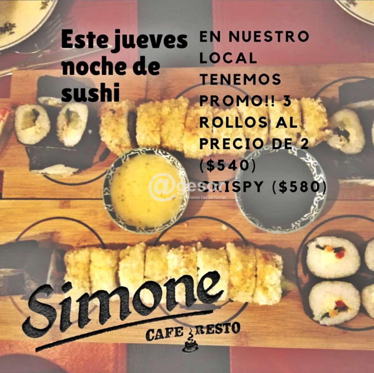 Este jueves la ya tradicional noche de SUSHI en SIMONE Café & Resto, en el local de avda. Lavalleja y Sánchez de Mercedes, allí te ofrecemos promo especial de tres rollos al precio de dos ($ 540) y Crispy ($ 580). Te esperamos este jueves en SIMONE para compartir otra noche de jueves con el tradicional SUSHI y la cálida atención de Verónica y su equipo.