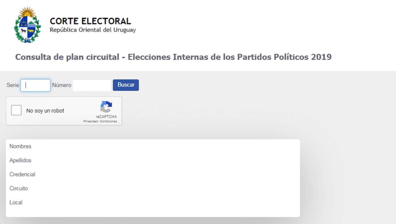 La Corte Electoral habilitó una plataforma donde se puede consultar, on line, el circuito que le corresponde votar en estas elecciones internas. Ingresando la serie y el número de Credencial Cívica se puede acceder a dicha información.