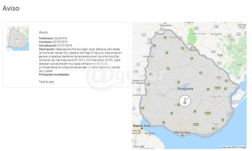 INUMET explica en su informe que la “Masa de aire fría de origen polar afecta el país desde la noche del martes 02 y hasta el domingo 07 de julio. Esta situación genera un gradual descenso de temperatura en los próximos días, oscilando las máximas entre 8dº/12ºC y mínimas entre -3º/2ºC. Cabe destacar que se prevén muy bajas sensaciones térmicas, principalmente en zonas donde se vean incrementados los vientos (sur y este)”. Un fenómeno que afecta a todo el país.