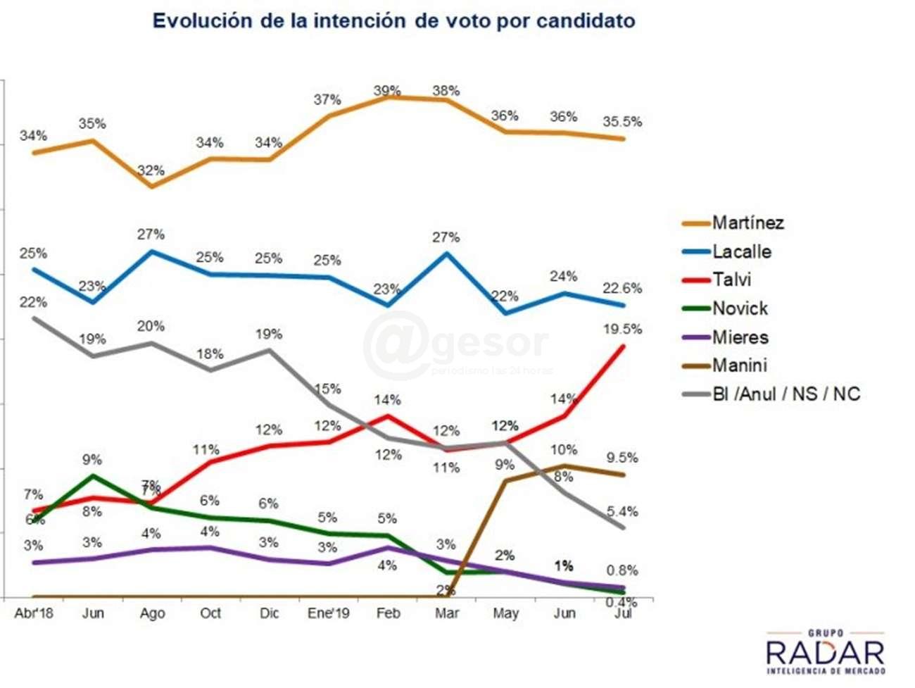 El Grupo Radar difundió la primera encuesta, realizada una vez que culminaron las elecciones internas, y se conoció quiénes serán los candidatos que presentarán en octubre próximo los partidos políticos. El resultado de esta encuesta, realizada entre el 4 y el 10 de julio pasado marca que el frenteamplista , Daniel Martínez encabeza las preferencias (35,5%), seguido del nacionalissta Luis Lacalle Pou (22,6%) y del colorado Ernesto Talvi (19,5%).