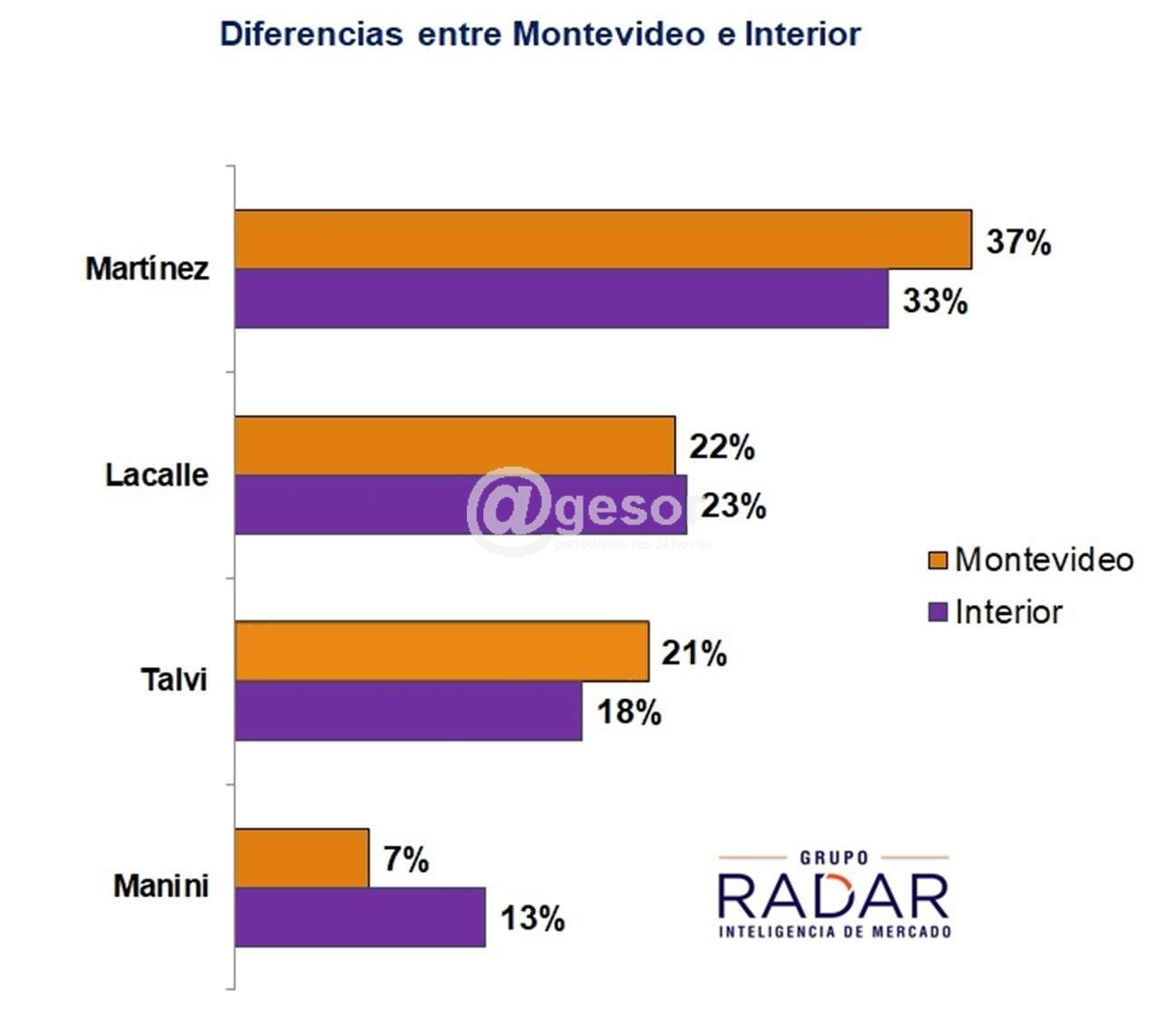 En Montevideo Daniel Martínez obtiene una intención de voto 15 puntos mayor que la de Lacalle, mientras que en el Interior la diferencia se reduce a 10 puntos. En el mismo sentido, Talvi está casi empatado con Lacalle en Montevideo, mientars que en Interior el cantidato del Partido Nacional saca 5 puntos de ventaja. Manini Ríos es particularmente fuerte en el Interior, donde obtiene casi el doble de intención de voto que en Montevideo y queda a tan solo 5 puntos del Partido Colorado.
