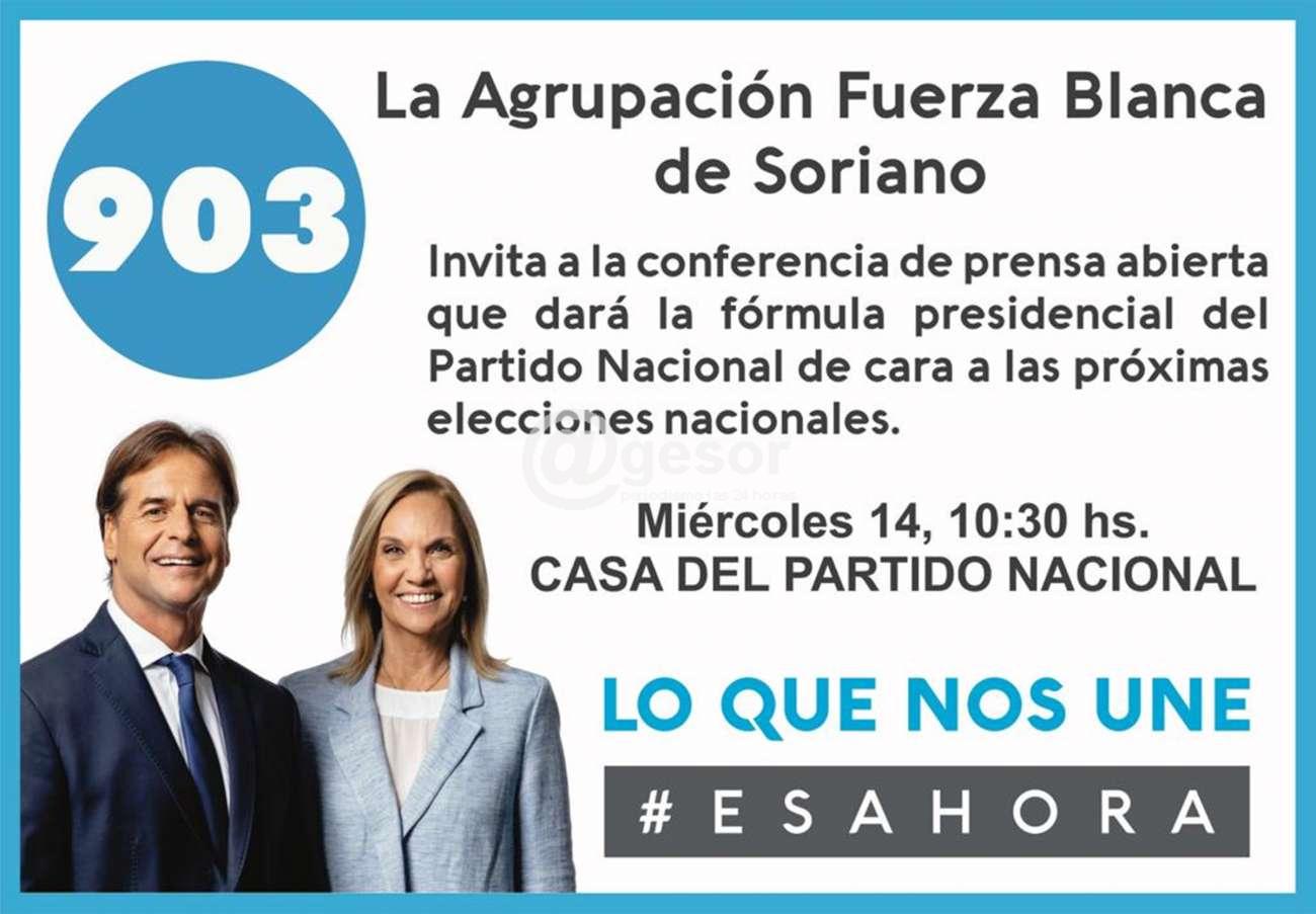 La Agrupación Fuerza Blanca de Soriano, Lista 903, invita a la conferencia de prensa de la fórmula presidencial del Partido Nacional, LUIS y BEATRIZ estarán este miércoles a las 10.30 horas en la Casa del Partido Nacional en Mercedes, de cara a las elecciones nacionales. Lo que nos une #ES AHORA