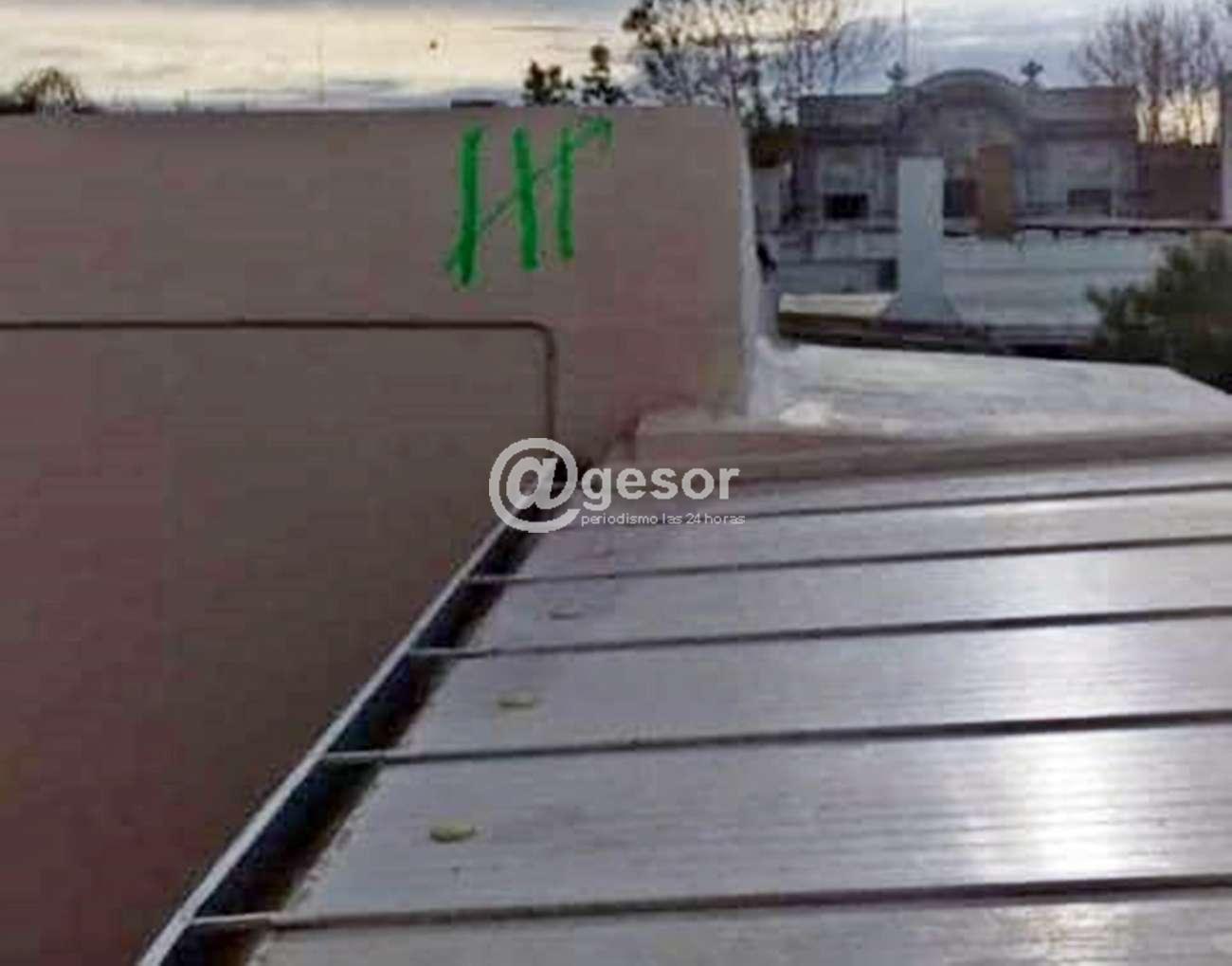 A su vez apareció la misma pintada que consiste en tres rayas paradas y una flecha que las cruza de izquierda a derecha, de abajo a arriba, en todos los casos con pintura en aerosol de color verde claro. En este caso la pintada apareció en un muro que está en la zona de los techos del Liceo 1 "Roberto Taruselli", para lo cual se estima que quien o quienes participaron de ello, habr+ian tenido que llegar al lugar ingresando por finca aledaña.