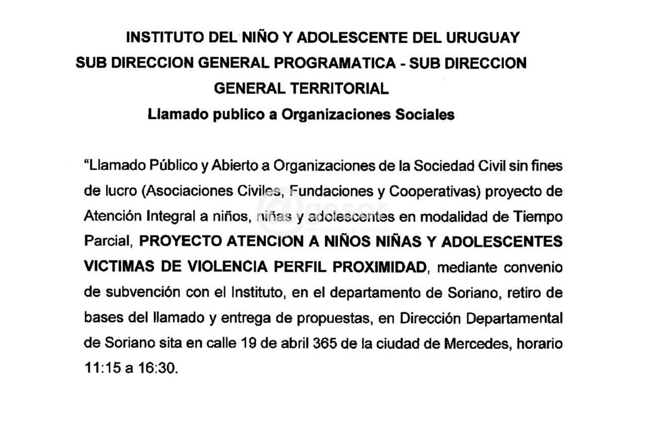 "Llamadop público y abierto a Organizaciones de la Sociedad Civil sin fines de lucro (Asociaciones Civiles, Fudnaciones y Cooperativas) proyecto de Atención Integral a niños, niñas y adolescentes en modalidad de tiempo parcial, PROYECTO ATENCION A NIÑOS, NIÑAS Y ADOLESCENTES VICTIMAS DE VIOLENCIA PERFIL PROXIMIDAD, mediante convenio de subvención con el Instituto, en el departamento de Soriano, retiro de bases del llamado y entrega de propuestas, en Dirección Departamental de Soriano sita en calle 19 de Abril 365 de la ciudad de Mercedes, horario 11.15 a 16.30.