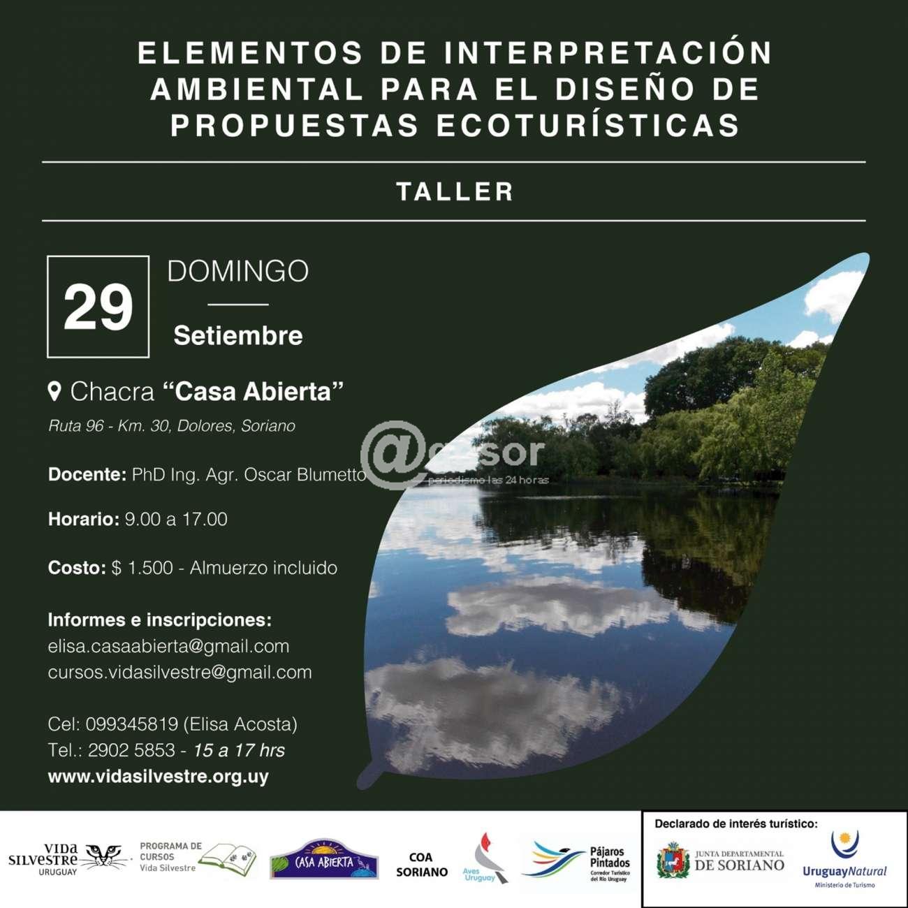 Asimismo el domingo 29 se ofrecerá un taller sobre "Elementos de interpretación ambiental para el diseño de propuestas ecoturísticas", también en el mismo lugar, dictado por el mismo docente y pudiéndose efectuar los contactos a través de los medios mencionados, el costo en este caso será de $ 1.500 ya que incluye el almuerzo, estableciéndose que la duracción es de 9.00 a 17.00 horas.