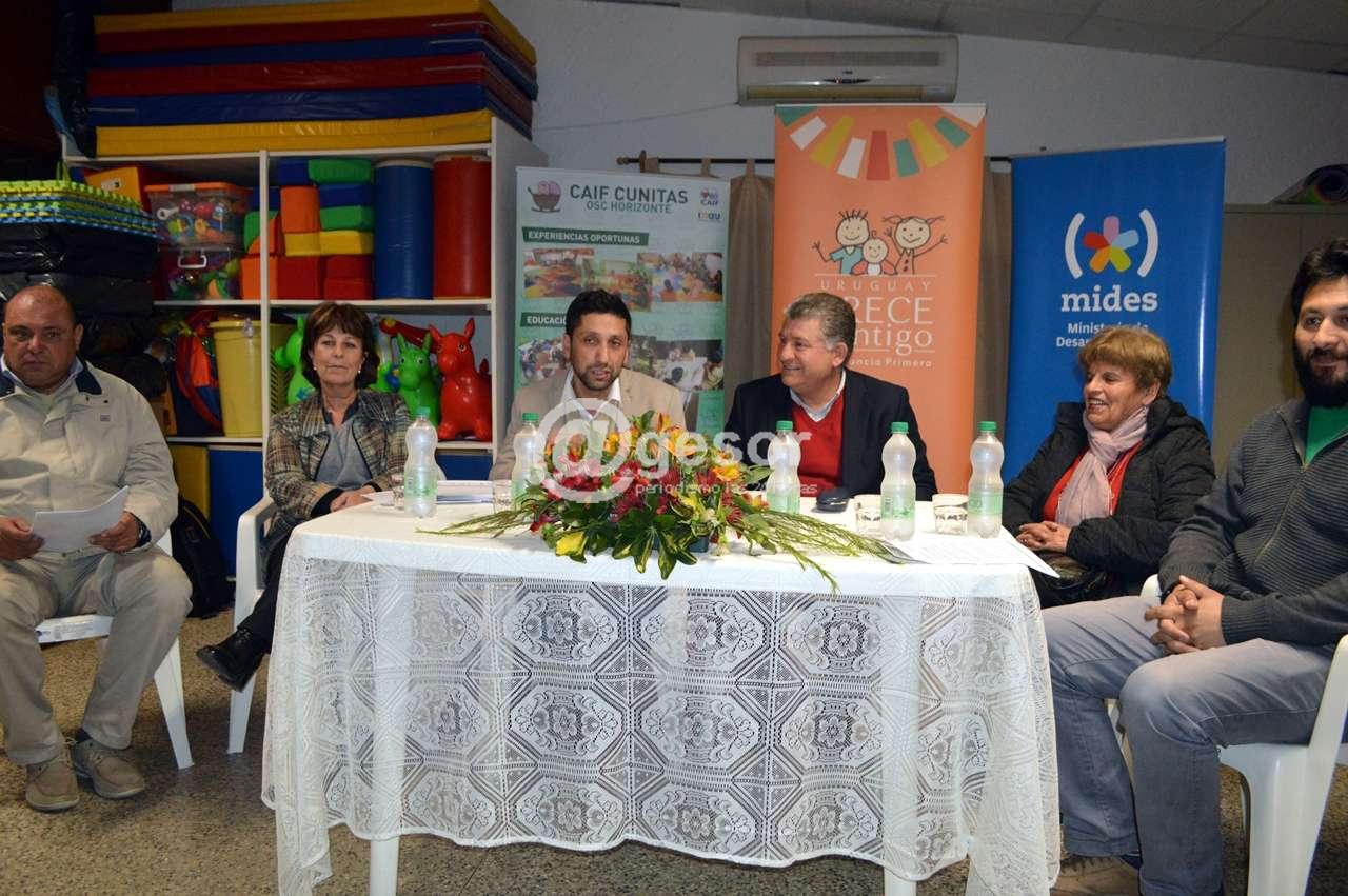 La mesa que presidió la ceremonia de presentación estuvo integrada por la presidenta de INAU Marisa Linde, Dardo Rodríguez integrante del directorio, Horacio Perazza Jefe de la Oficina Departamental de INAU, Dr. Pablo Marrero director departamental del MIDES, Lic. Adrián Magallanes, referente del programa Uruguay Crece Contigo y Gladys Riso en representación de la sociedad civil.